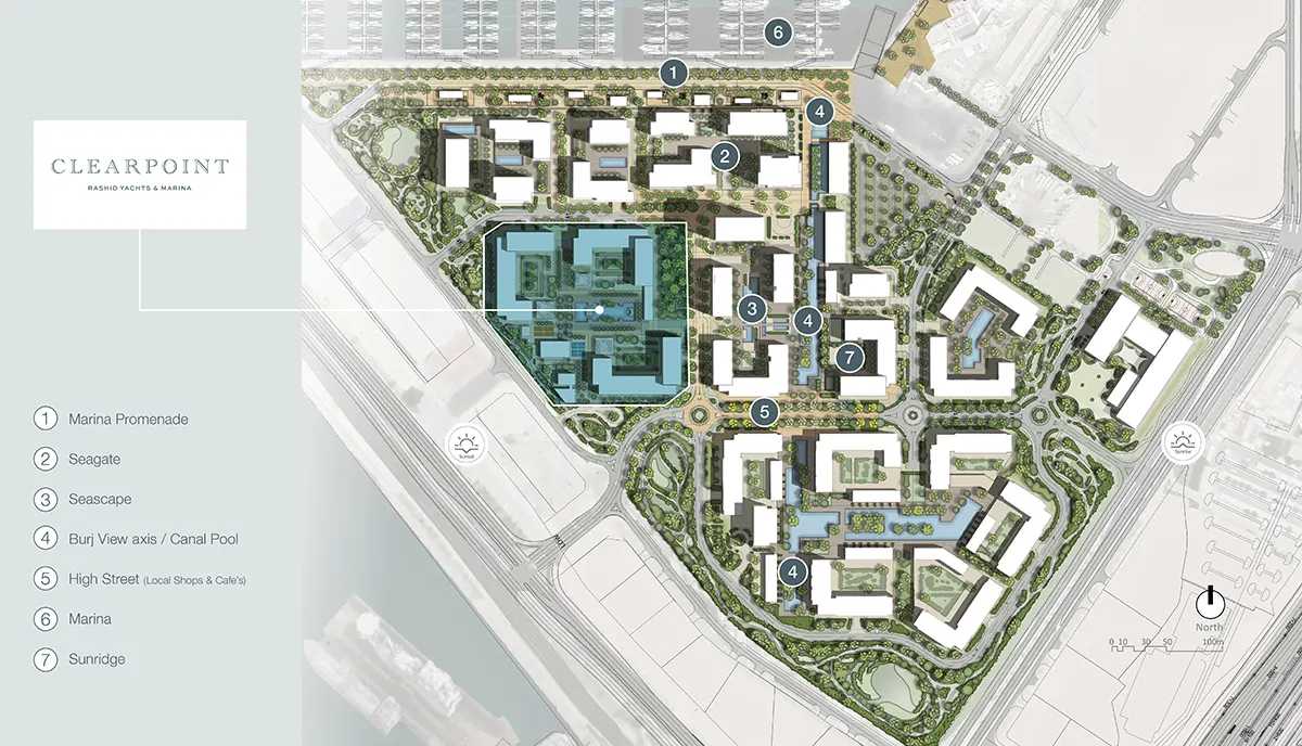 Clearpoint is set within the heart of Rashid Yachts & Marina, a prime waterfront development in Port Rashid, Bur Dubai. This strategic location offers residents direct access to Dubai's historic and cultural district, as well as proximity to the bustling downtown area. The sub-community is perfectly positioned to provide easy access to the city's top attractions, including the Dubai Mall, Burj Khalifa, and the Dubai Opera. The nearby Sheikh Rashid Road and Al Mina Road ensure seamless connectivity to the rest of Dubai, making it an ideal choice for both residents and investors. The area is also well-serviced by public transportation, including metro stations, buses, and water taxis, enhancing the convenience of daily commutes.