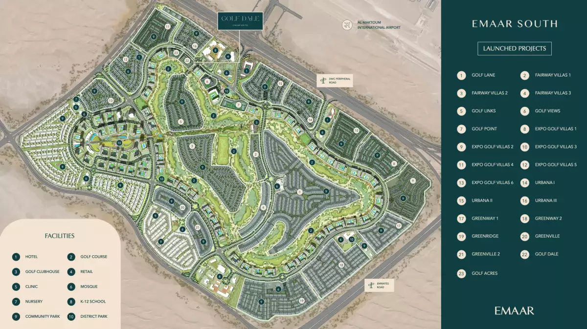 The development's prime position within Emaar South places residents of Golf Dale at the center of Dubai's upcoming boom corridor. The development's prime position offers unparalleled access to key areas of Dubai and beyond: