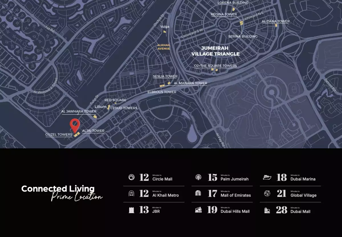 Guzel Tower combines suburban peace and urban convenience in a superb location inside Jumeirah Village Triangle. Residents will benefit from a tranquil haven away from the bustle of the city, as well as convenient access to major attractions and commercial centers.