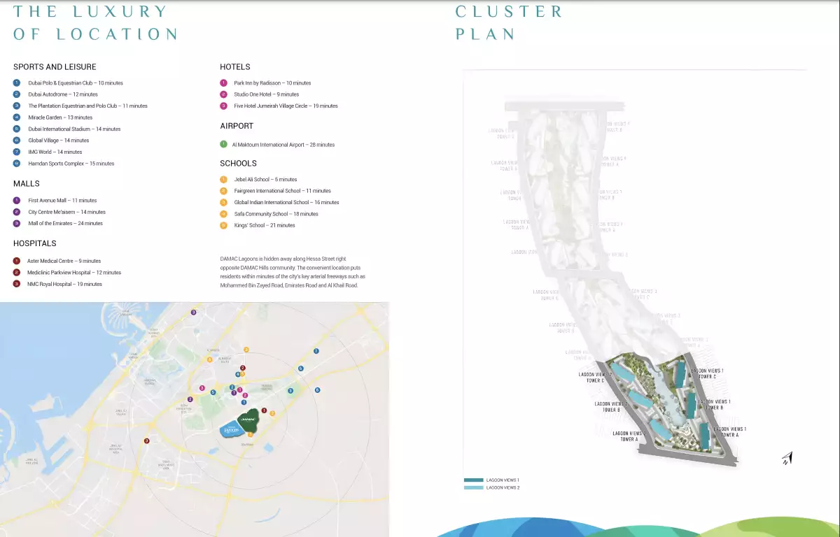 - Experience the pinnacle of Damac Lagoon Views, Damac Properties' newest development with a select number of 1 and 2-bedroom apartments with lagoon views at Damac Lagoons, Dubai. This architectural marvel offers the ideal fusion of modern elegance and Mediterranean lifestyle while tucked away in the center of the energetic Dubai neighborhood. The project provides an exceptional living experience with its distinctive façade and breathtaking views. Discover a top-notch way of life in Dubai's magnificent neighborhood, which is ideally situated close to well-known landmarks including the Mall of the Emirates, Expo 2020, and Dubai Marina.