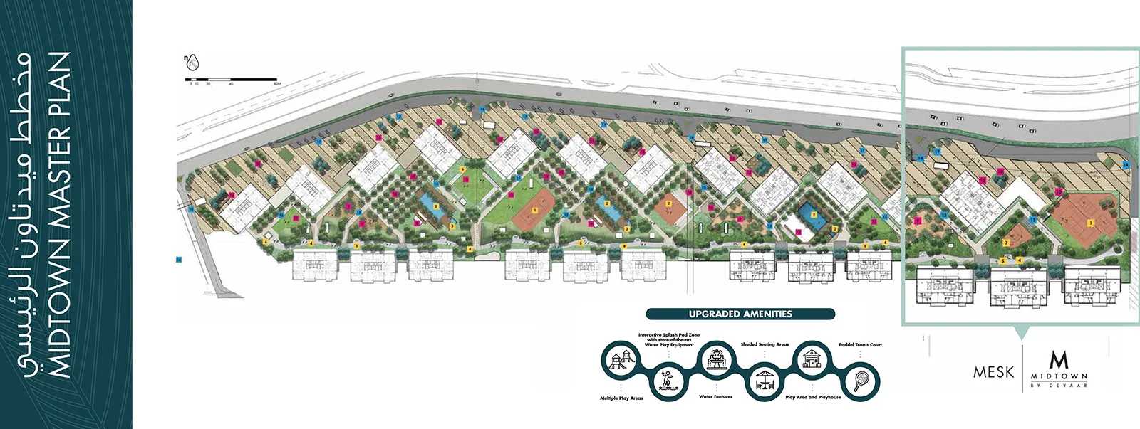 The thoughtful design also extends to the community layout, which integrates open spaces, landscaped gardens, and pedestrian-friendly pathways. The public areas are designed to foster social interaction and community engagement, with strategically placed seating, shaded walkways, and children’s play areas. The overall architectural vision of Mesk District is to create a harmonious blend of urban living with a community-oriented environment that promotes wellness, connectivity, and sustainability.