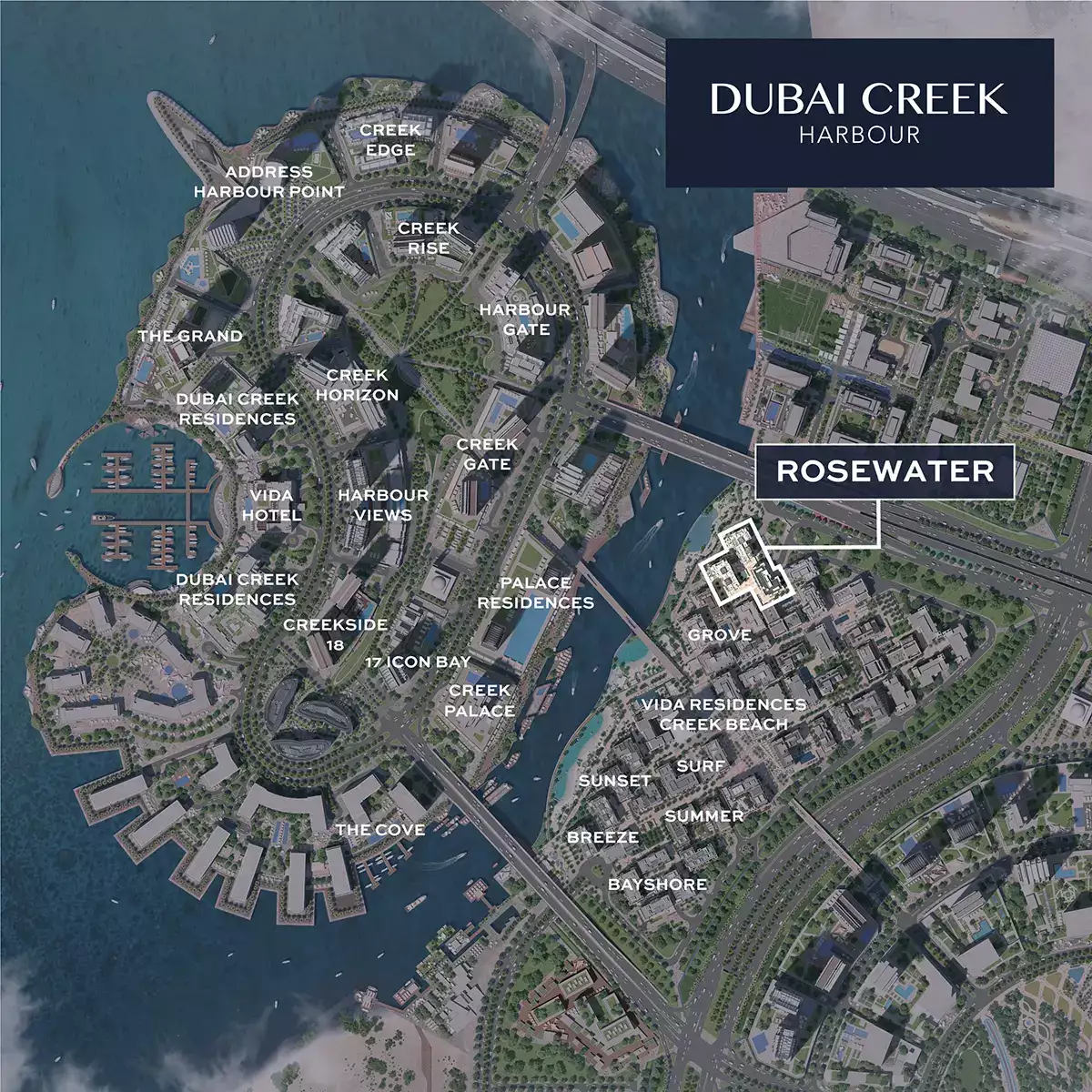 The most recent project from Emaar Properties is Rosewater at Creek Beach, which provides tastefully decorated beachfront villas in Dubai Creek Harbour, United Arab Emirates. Following Grove's enormous success, this is a brand-new building with three high-rise residences.
