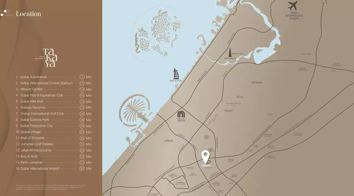 Takaya is situated in the bustling and vibrant area of Dubai Motor City. In addition to offering homeowners easy access to major attractions and essentials, this fantastic location offers the ideal balance of excitement and peace. It is a great solution for both families and professionals because of its close access to important locations.
