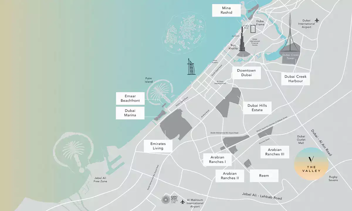 The Valley is a charming and bustling neighborhood where modern neighborhoods are interwoven with lush vegetation. It is situated along Dubai-Al Ain Road and offers the ideal mix of accessibility and tranquility, providing a getaway from the bustle of the city while maintaining connections to everything Dubai has to offer.
