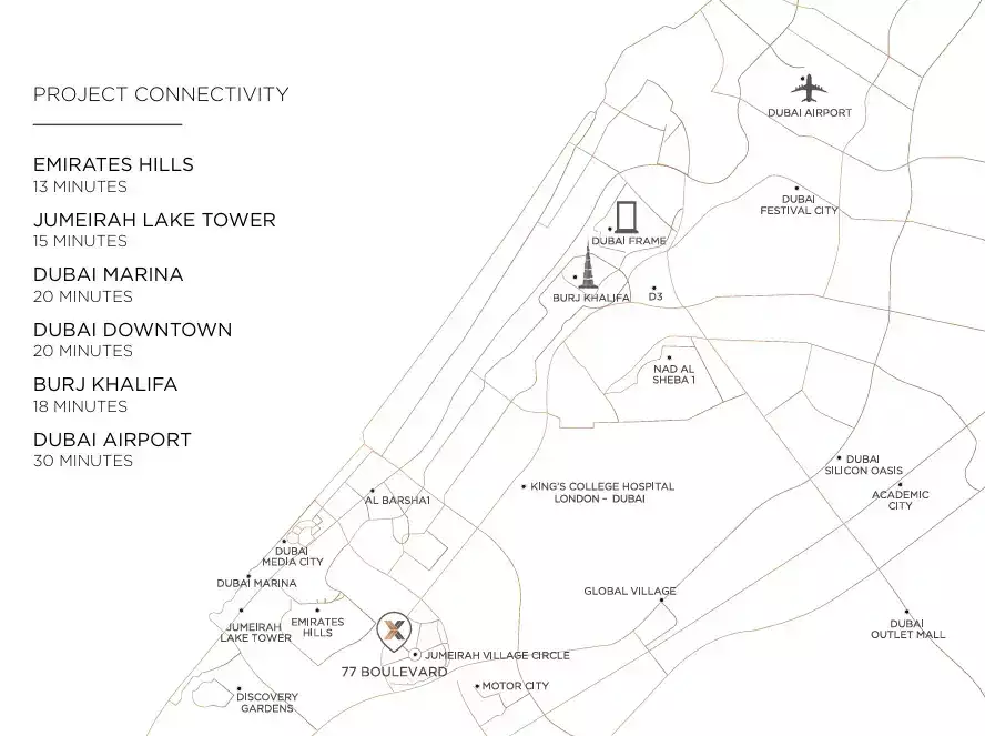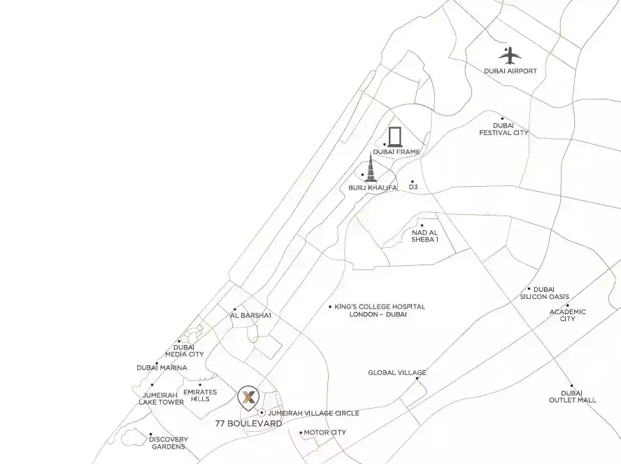 Enter the world of 77 Boulevard at JVC, a pioneering 07-storey residential marvel developed by Bam Real Estate Development with premium apartments in Dubai. This architectural gem is inspired by the modern design presenting a new way of living, with sophistication and a level of comfort you can’t find anywhere else. At this façade, with just a select collection of residential units with private Jacuzzis at some, this is an appealing place of solitude, comfort, and a sense of belonging. Located strategically in Jumeirah Village Circle, offering the privileged with ultimate access to Dubai’s most famous landmarks. Either way, whether it’s the buzzing atmosphere of Marina, the tranquil beach of JBR Beach or the retail lure of Business Bay, everything is just minutes away. Located just a short distance from Al Khail Road, residents can also enjoy hassle free travel around the city.