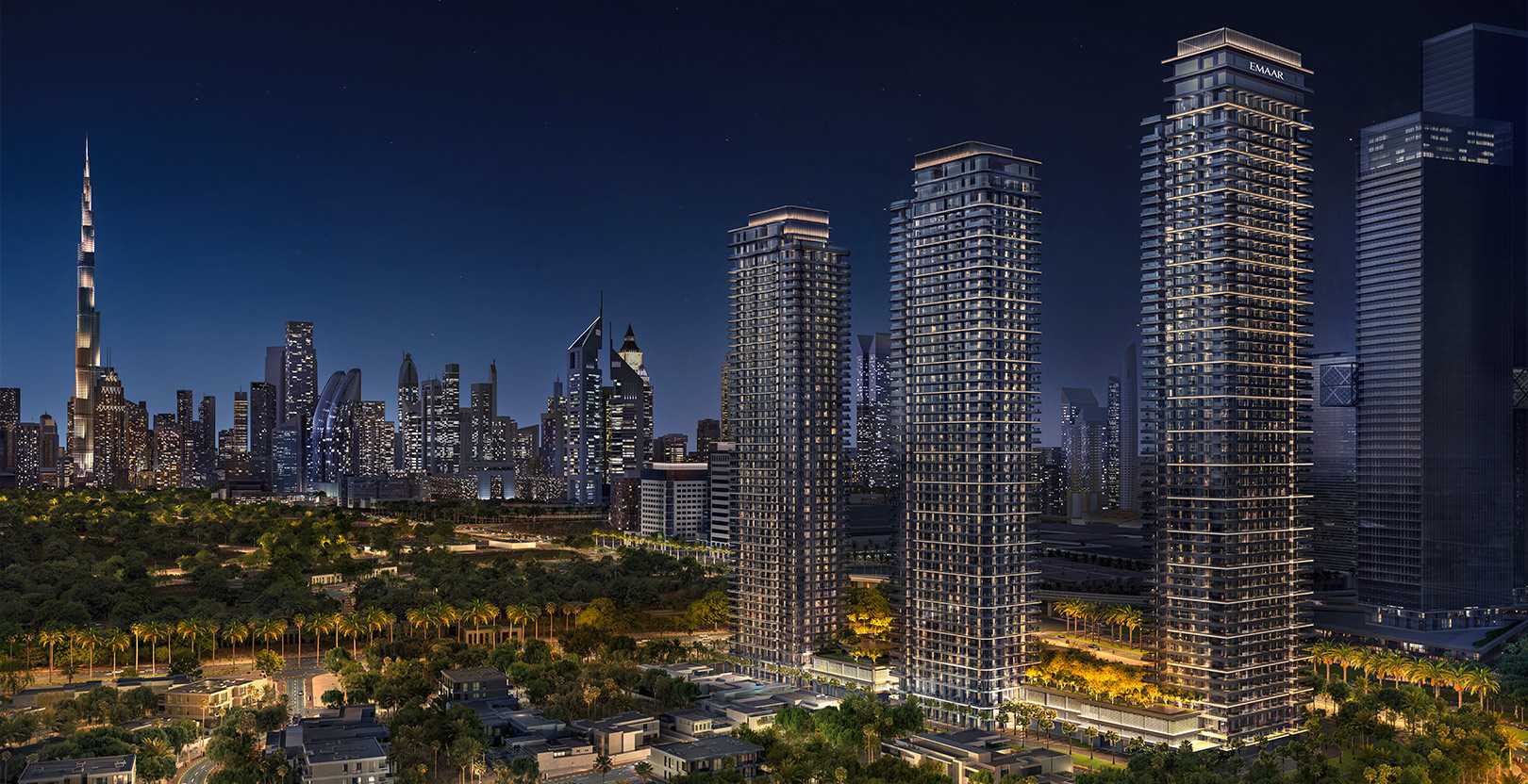 Multi‑tower layout with mixed‐use residences—studios to three‑bed penthouses