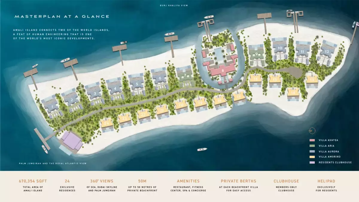 Spread across 670,354 sq. ft., Amali Island offers a rare opportunity to own a piece of paradise with uninterrupted 360-degree views of the Arabian Gulf, the Dubai skyline, and the iconic Palm Jumeirah. Each residence is crafted with meticulous attention to detail, offering a harmonious blend of natural beauty, refined interiors, and contemporary luxury.