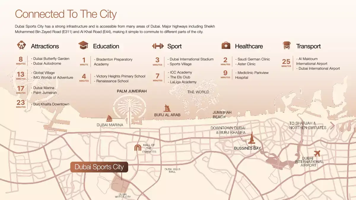 Set in a prime location within Dubai Sports City, residents enjoy seamless connectivity via Sheikh Mohammed Bin Zayed Road (E311) and Al Khail Road (E44), putting major landmarks like the Dubai International Cricket Stadium, The Els Club, and ICC Academy within minutes. With access to top schools, healthcare facilities, cafes, restaurants, retail outlets, and airports, this is a location crafted for families and professionals alike.