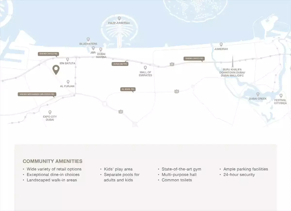 Located in the heart of Al Furjan, the development enjoys seamless connectivity via Sheikh Zayed Road and Mohammed Bin Zayed Road, with quick access to Ibn Battuta Mall, Dubai Marina, Jebel Ali Free Zone, and Expo City Dubai. The neighbourhood is family-friendly and pedestrian-oriented, surrounded by schools, healthcare facilities, retail outlets, and landscaped open spaces.