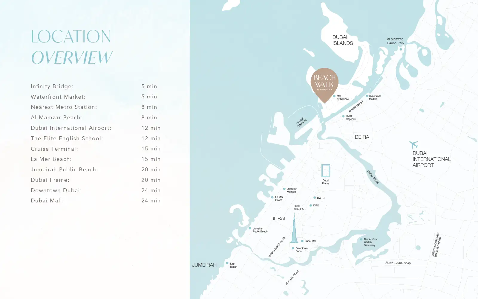 Situated at the peak of Dubai Islands' development, the façade offers its occupants the perfect balance of seclusion and social connection. Downtown Dubai and Dubai International Airport are just a short drive from the property, making it simple to navigate the bustling city's attractions. Within a short commute, residents can take advantage of the close vicinity to well-known locations, including Al Mamzar Beach, Waterfront Market, and Deira Mall. The recently constructed Infinity Bridge provides easy access to major metropolitan tourism attractions and enhances connectivity by seamlessly joining the islands with the mainland.