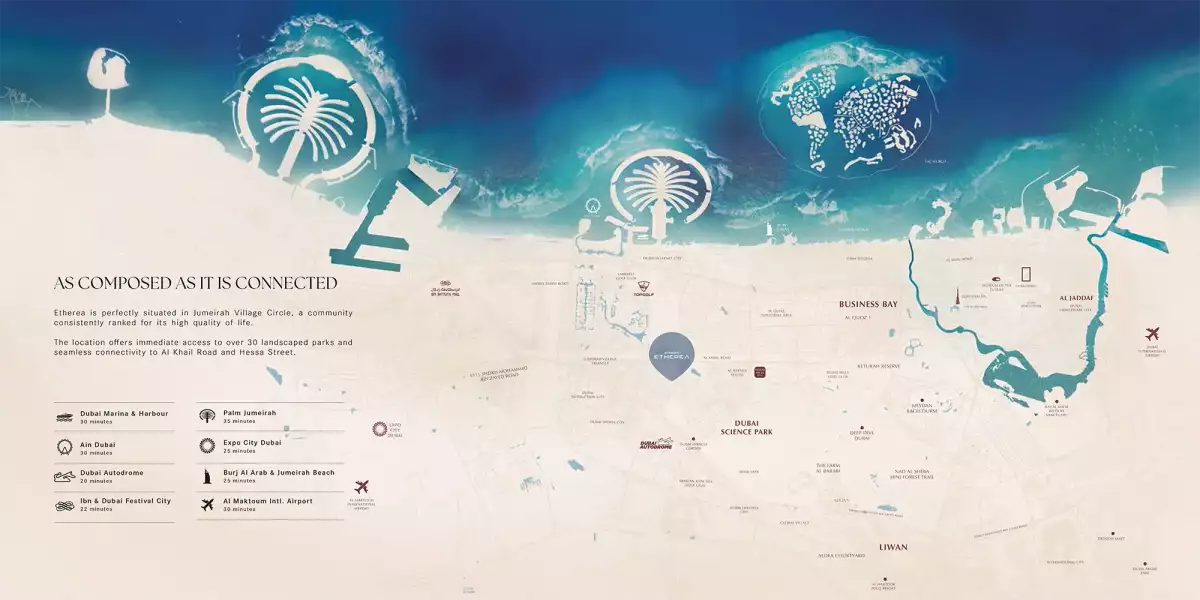 - 30 Minutes: Dubai Marina, Ain Dubai, and Al Maktoum International Airport.