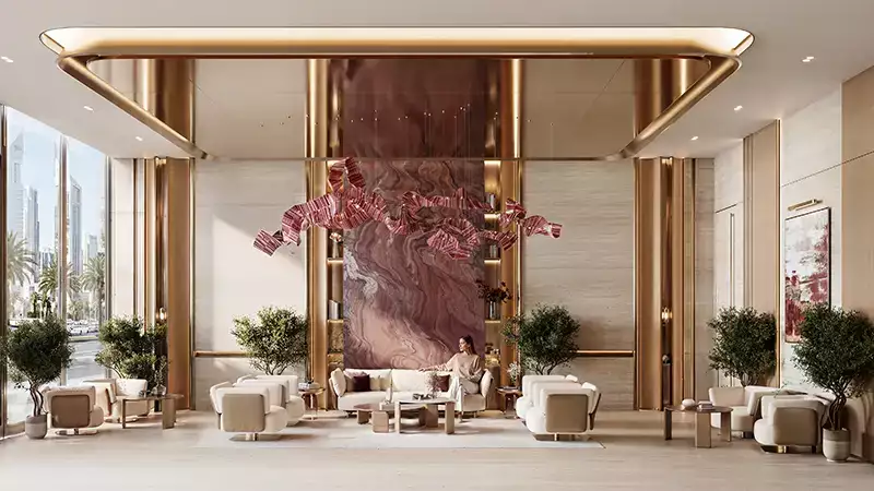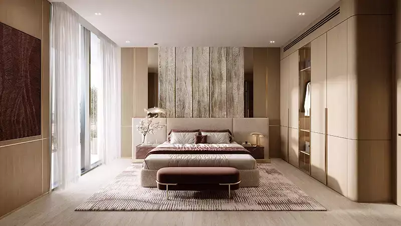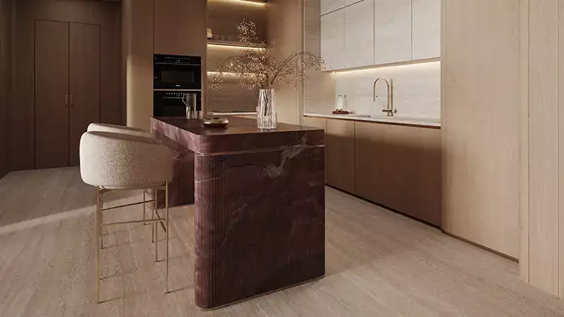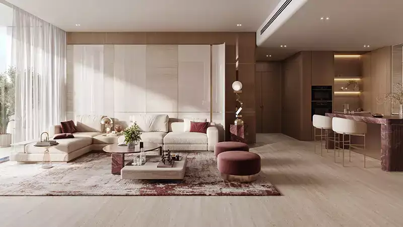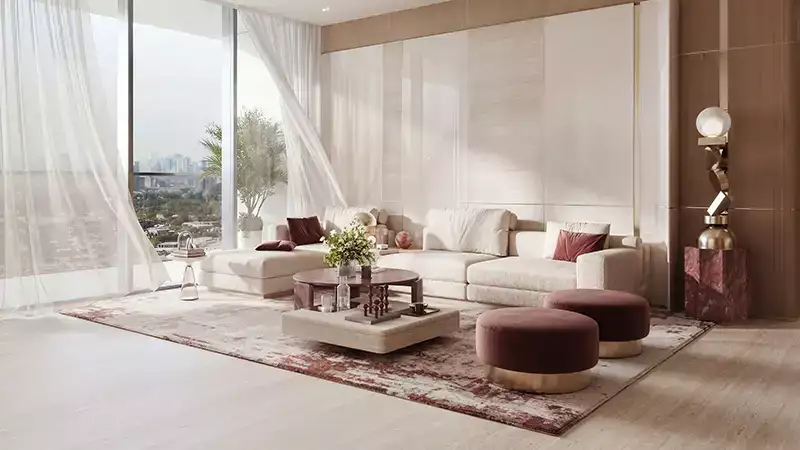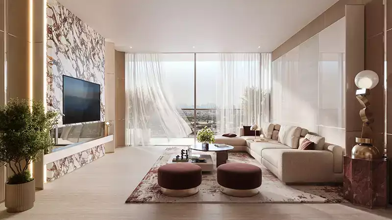 - The residences emphasize open-plan living with oversized glazing to maximize natural light and offer expansive community views. Premium finishes include travertine stone flooring, marble accents, fluted oak wood detailing, and bronze-toned finishes.