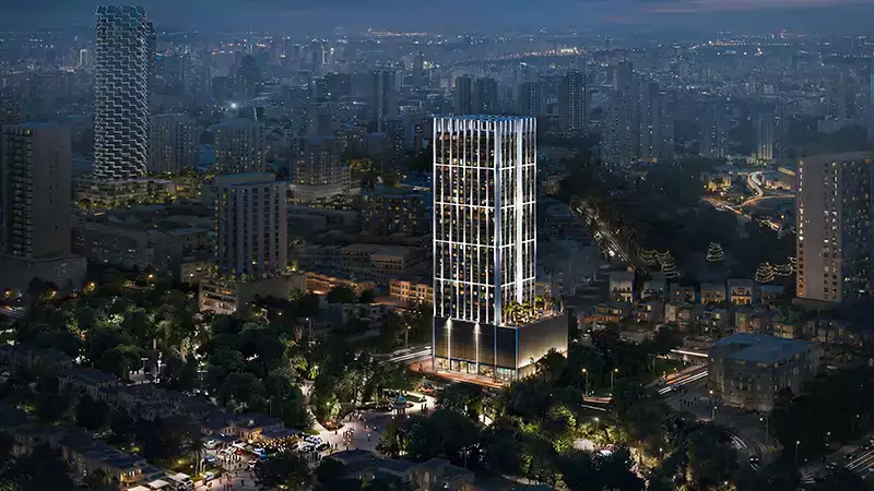Binghatti Etherea is a premium residential and retail landmark by Binghatti Developers, strategically positioned in the heart of Jumeirah Village Circle (JVC), Dubai. Designed as a contemporary urban sanctuary, the project is defined by a striking 112.30-meter high-rise structure featuring an iconic geometric façade with satin chrome and crystalline finishes.