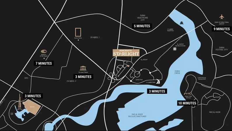 Nestled in Healthcare City Phase 2, Al Jaddaf, Binghatti Starlight occupies a strategic position in the heart of Dubai’s flourishing healthcare and wellness district. Residents will enjoy seamless connectivity—just minutes from Al Jaddaf Metro Station and Sheikh Rashid Road—linking you effortlessly to Downtown Dubai, Business Bay, and the rest of the city.