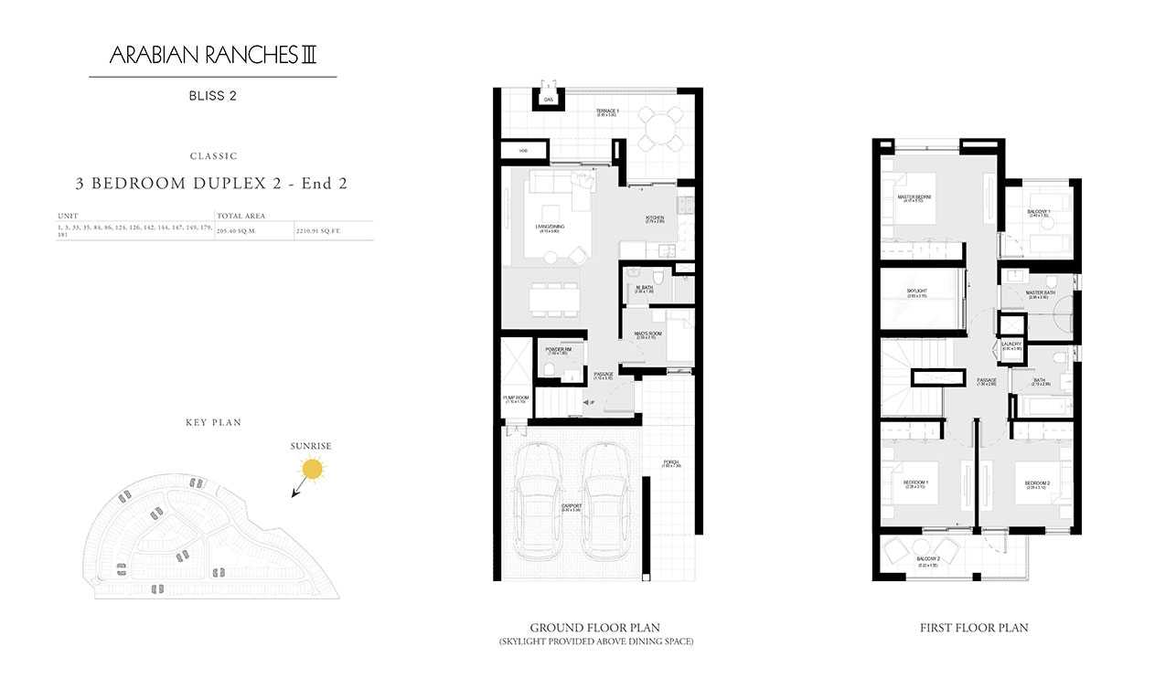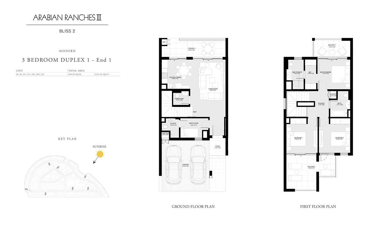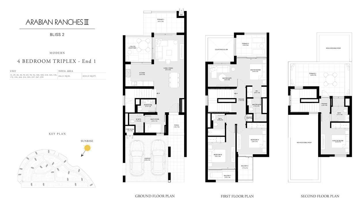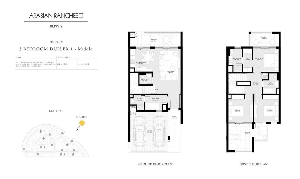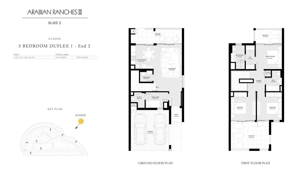 Ground Floor: Carport Maid Room Maid Bathroom Powder Living Room Kitchen/Dining TerraceFirst Floor Balcony 1 Master Bedroom WIC Master Bathroom Laundry Bedroom 02 Bathroom 02 Bedroom 03 Bathroom 03 Balcony 2