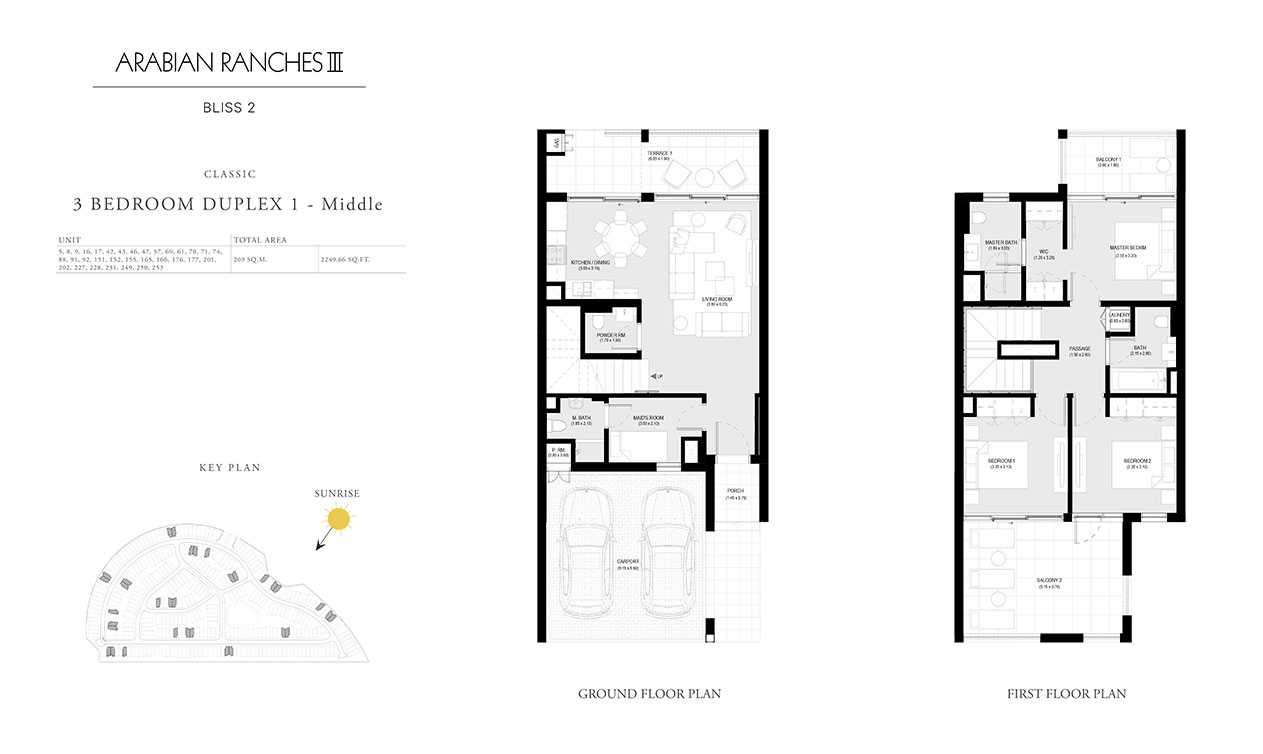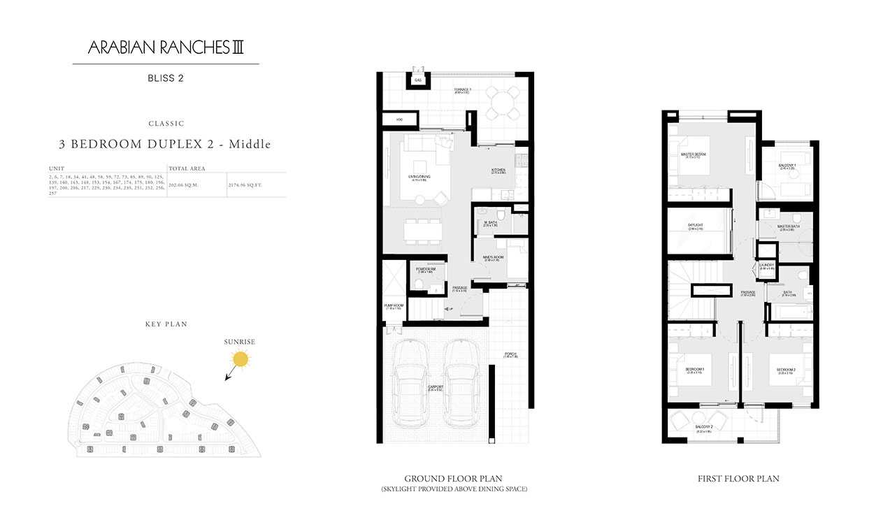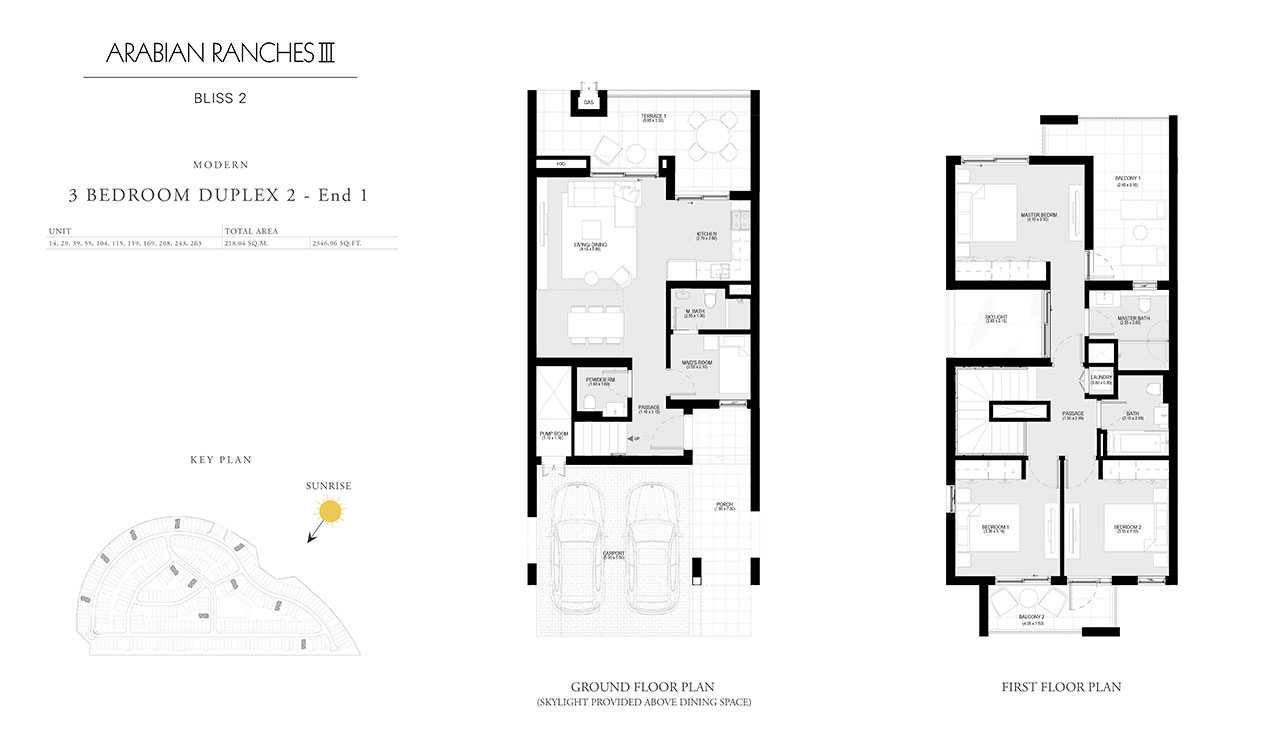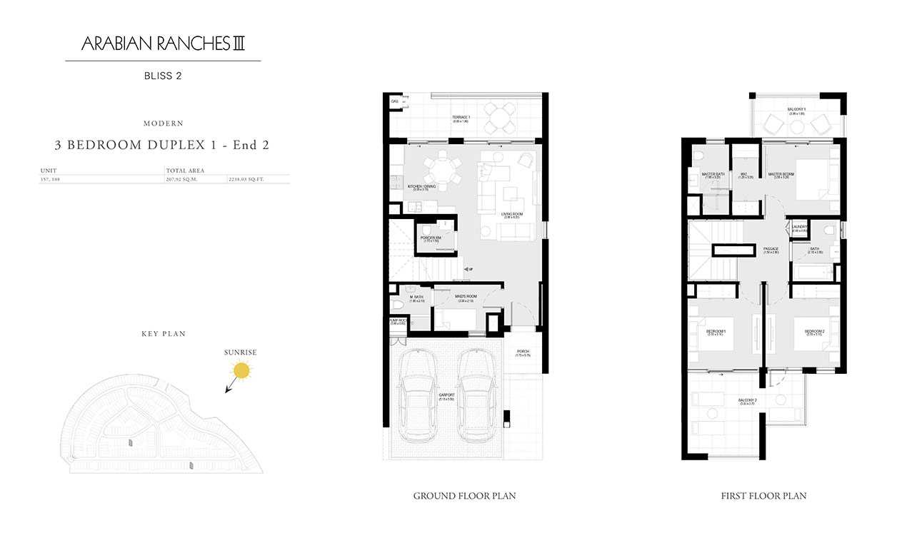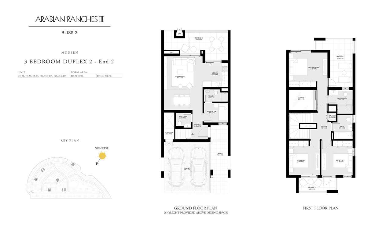 Ground Floor: Carport Maid Room Maid Bathroom Powder Living Room Kitchen/Dining TerraceFirst Floor Balcony 1 Master Bedroom WIC Master Bathroom Laundry Bedroom 02 Bathroom 02 Bedroom 03 Bathroom 03 Balcony 2