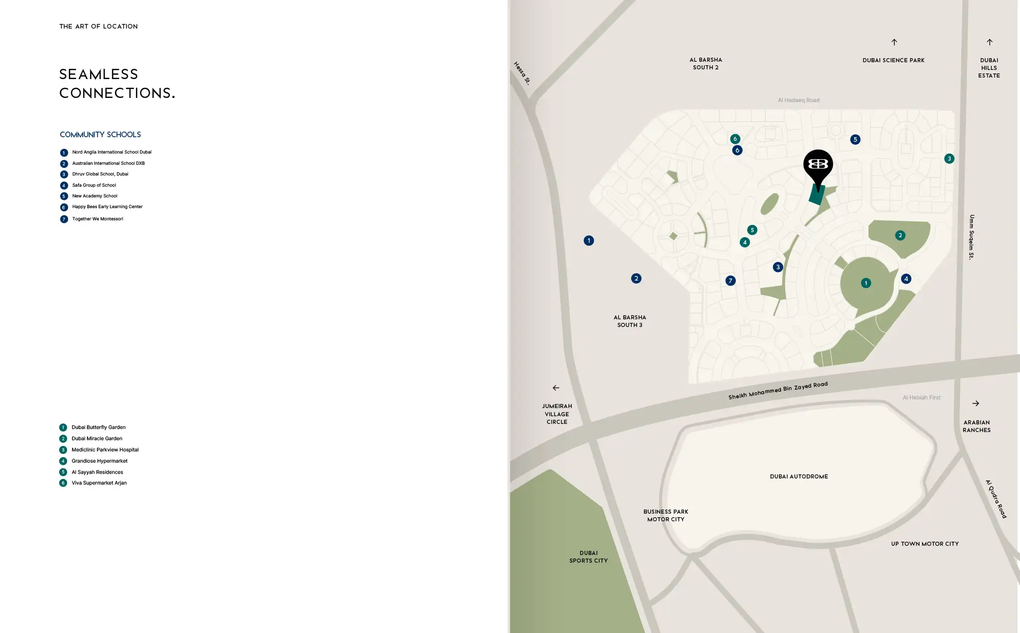 Strategically located, residents enjoy immediate access to major roads such as Sheikh Mohammed bin Zayed Road and Umm Suqeim Road, placing the city's key attractions—Mall of the Emirates, Dubai Miracle Garden, and Global Village—within minutes. Despite its central location, Bond Enclave offers a tranquil suburban setting, surrounded by green spaces and upscale conveniences.