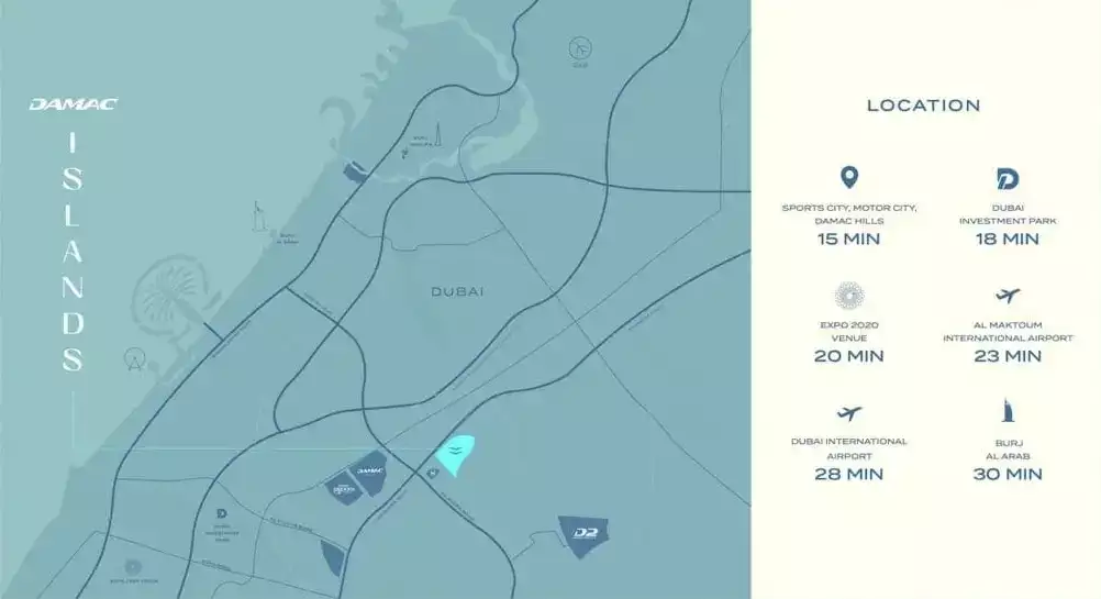 Bora Bora 3 is situated in a prime area of the Damac Islands, where peace and creativity coexist. This beautiful neighborhood is close to important centers and neighborhoods; Expo City is 26 minutes away, and Dubai Hills Estate is 25 minutes away by car. Additionally, it takes 20 minutes to get to Al Maktoum International Airport.