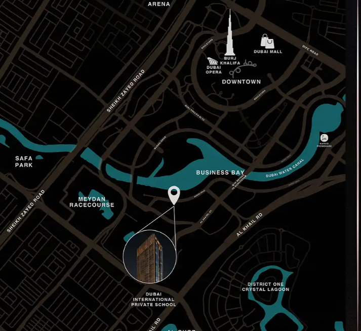 The development offers views of an urban park and direct access to the Business Bay Canal.
