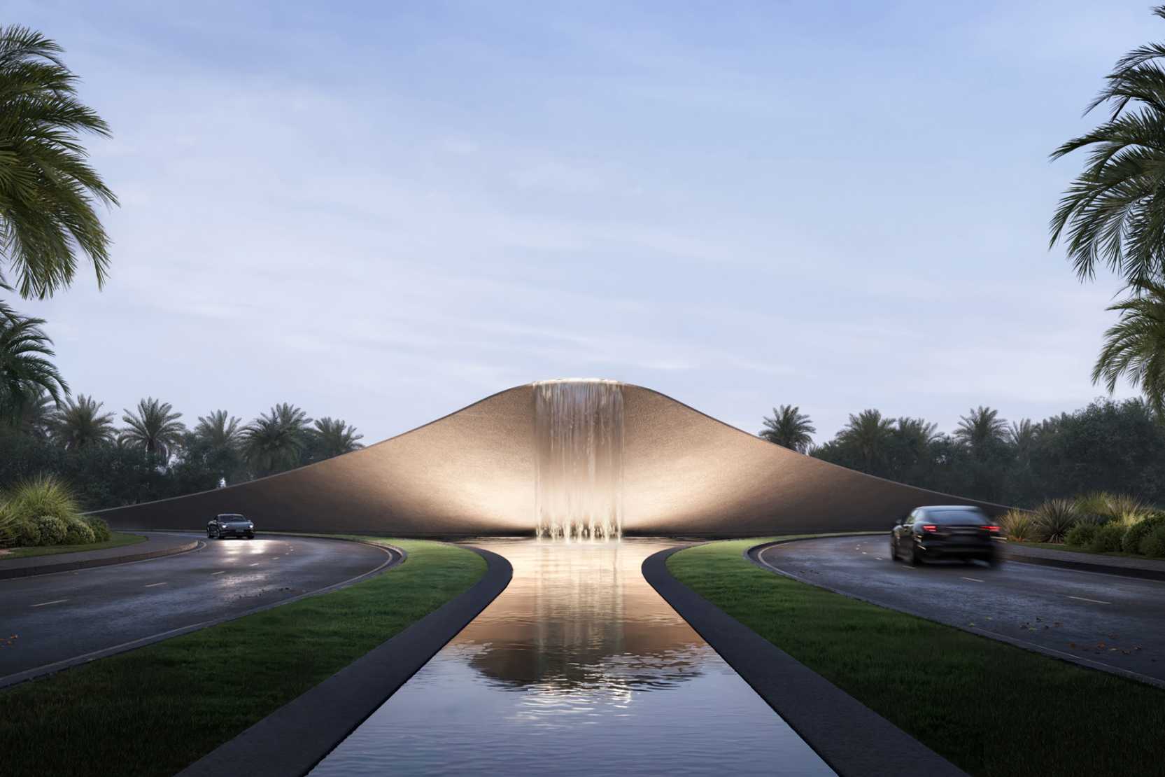 An organic spiral design that surrounds a spacious patio with landscaping. Entering the building reveals an inviting hidden gem. The stables' iconic design is set to become a major worldwide landmark in the equestrian industry.
