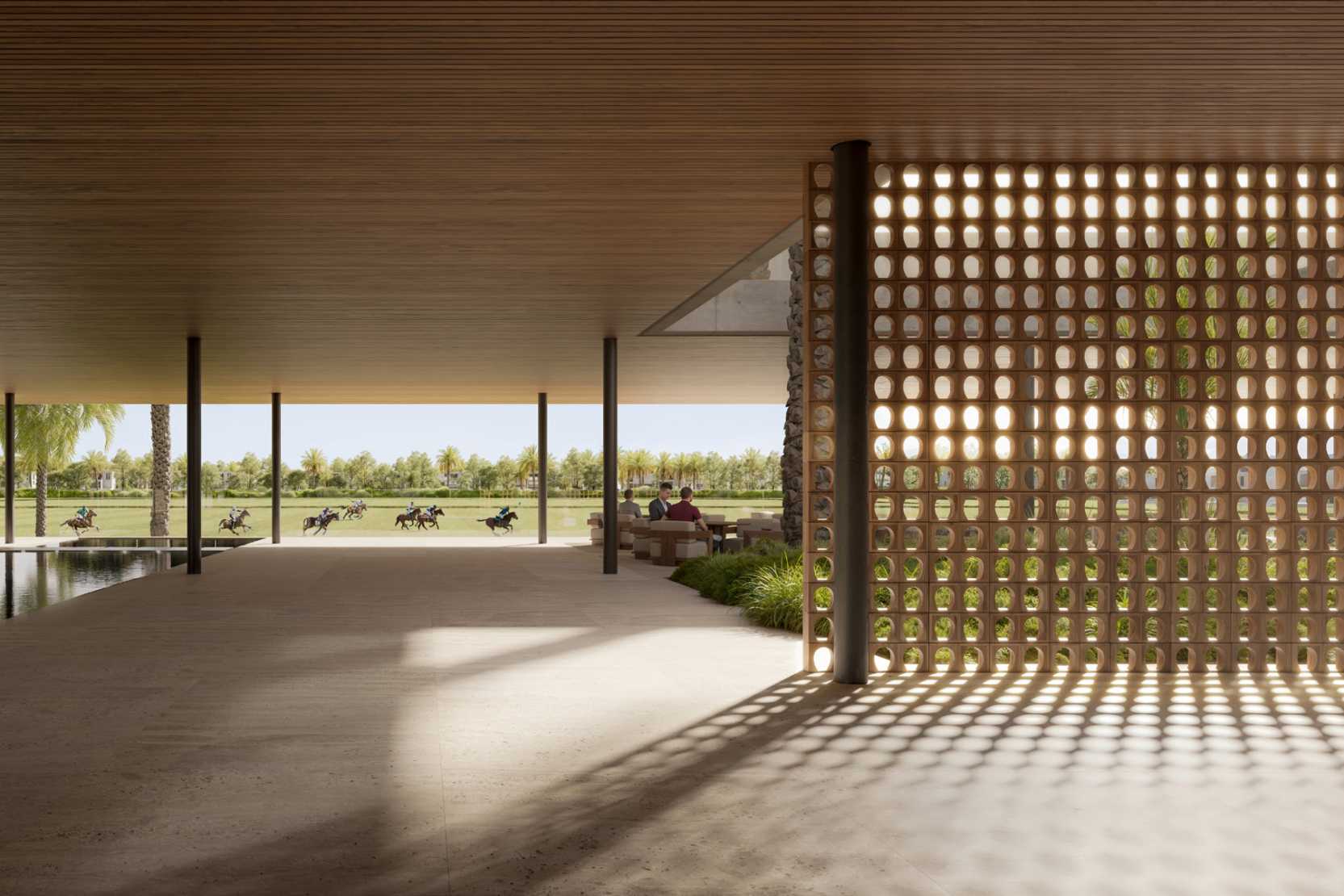This area was designed to maximize the horses' energy and speed. The goal of seamless landscapes is to provide a modern interpretation of traditional polo grounds. The Polo Fields, which span 340,000 square meters, create the monumentality of the vision by drawing inspiration from the natural world and soil textures.