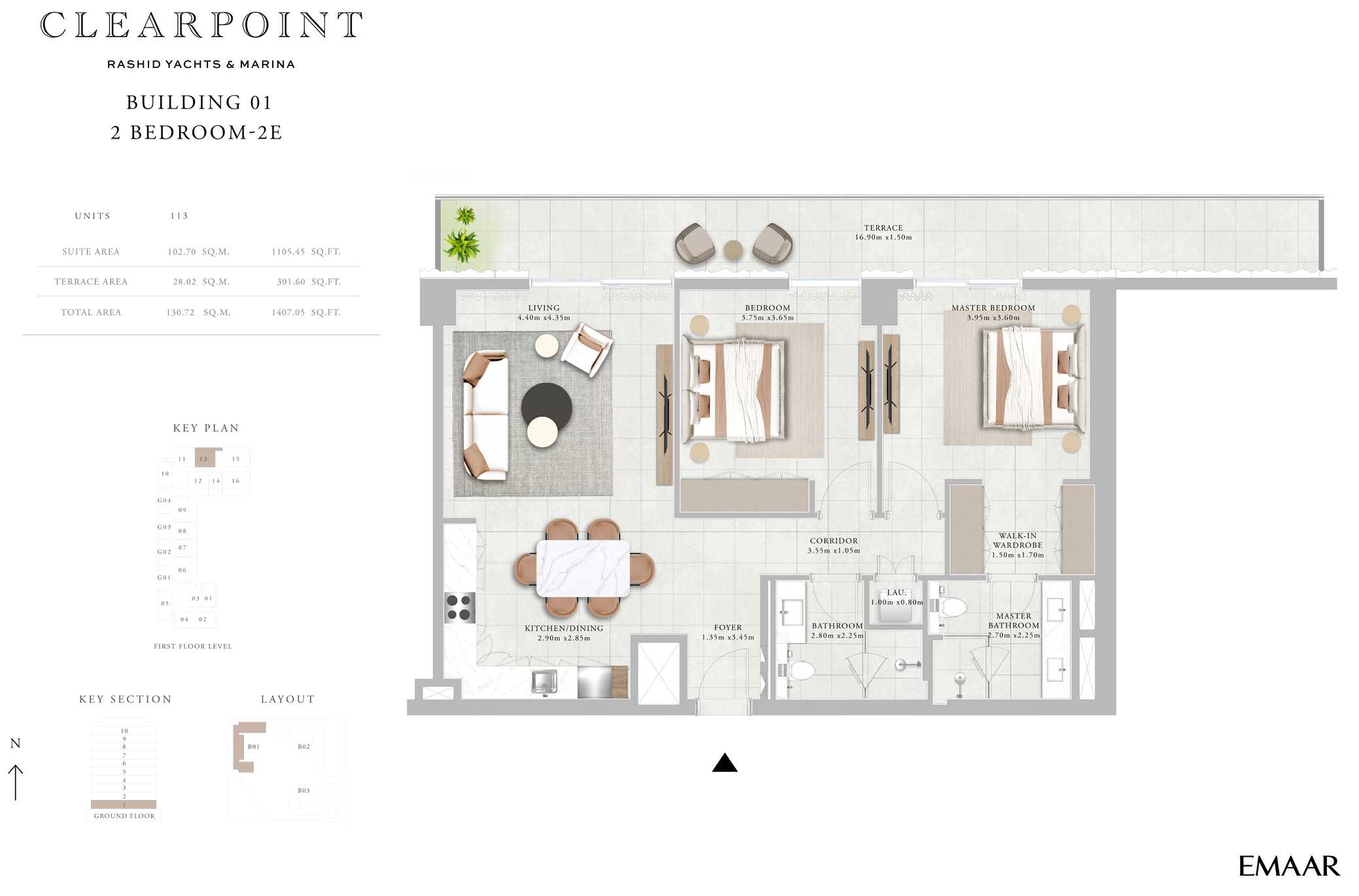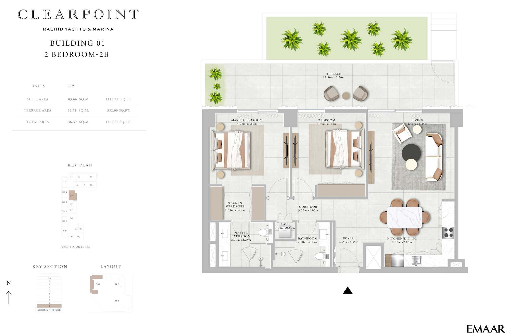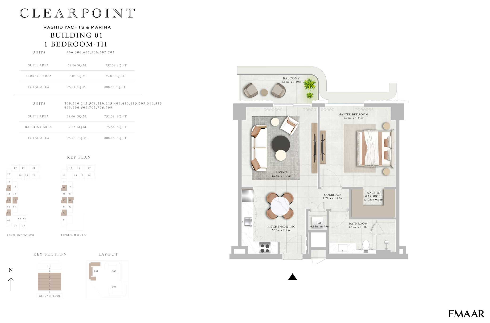 The building’s architecture blends modern elegance with coastal charm. Featuring a clean-lined contemporary façade, light-toned materials, and glass-fronted balconies, the design maximizes views and natural light. The building’s alignment within the Clearpoint trio creates a harmonious skyline along the marina edge, reflecting Emaar’s high standards of urban planning and aesthetics.