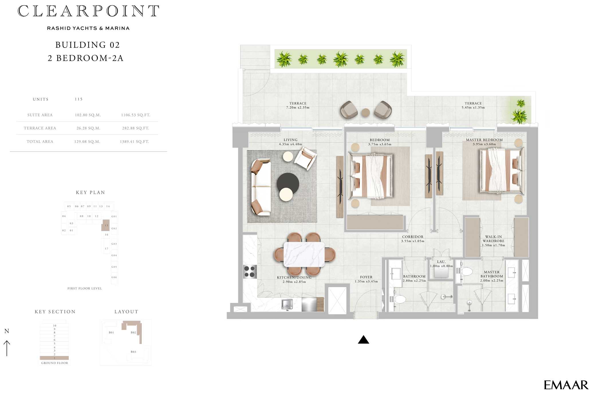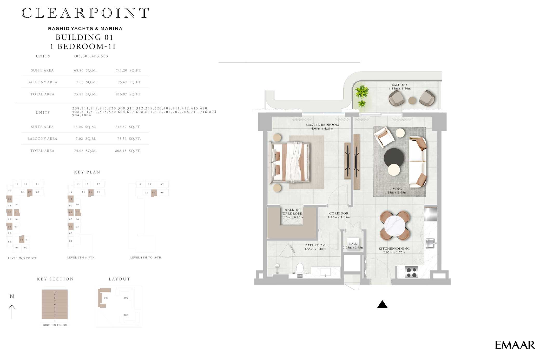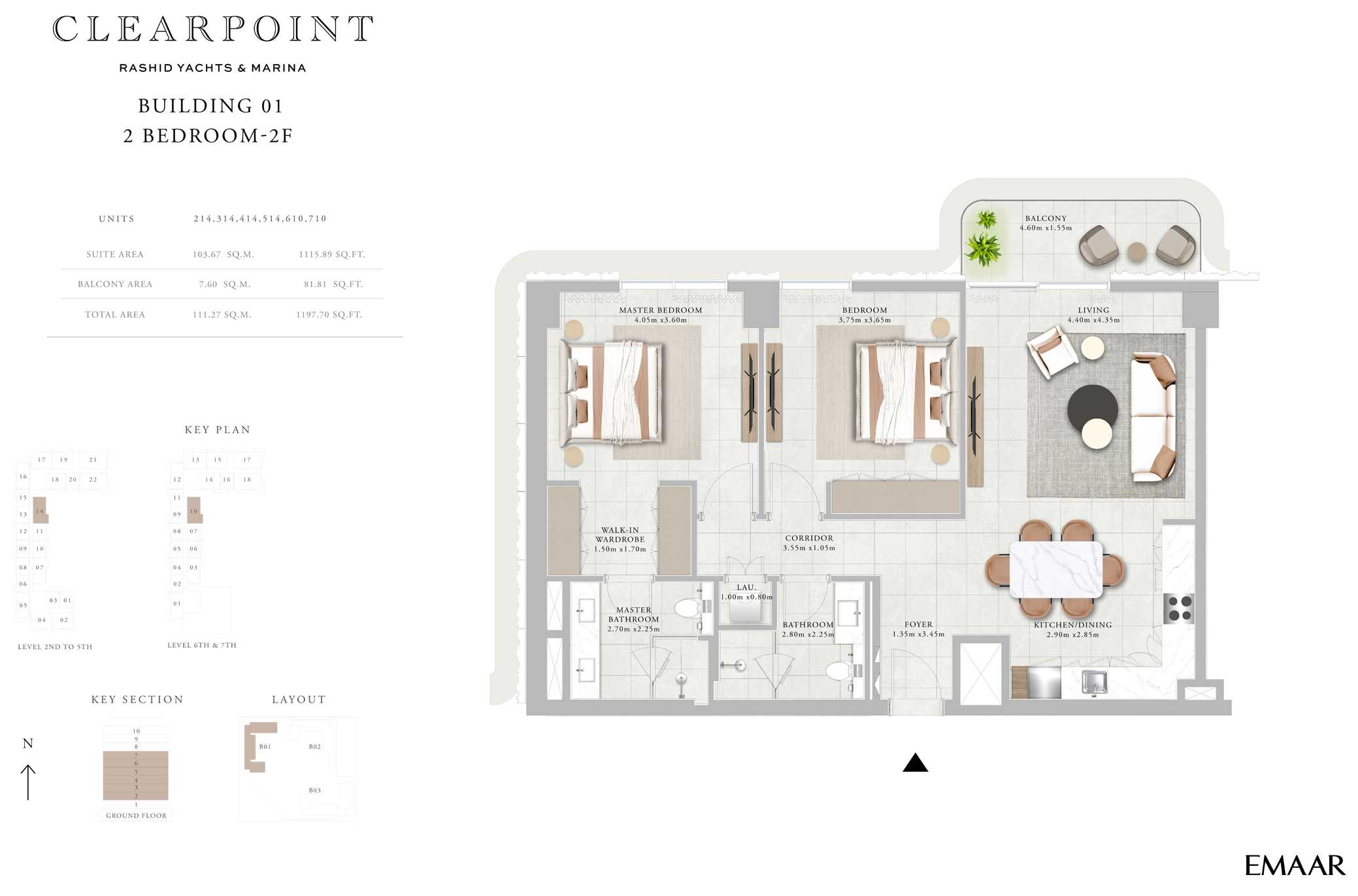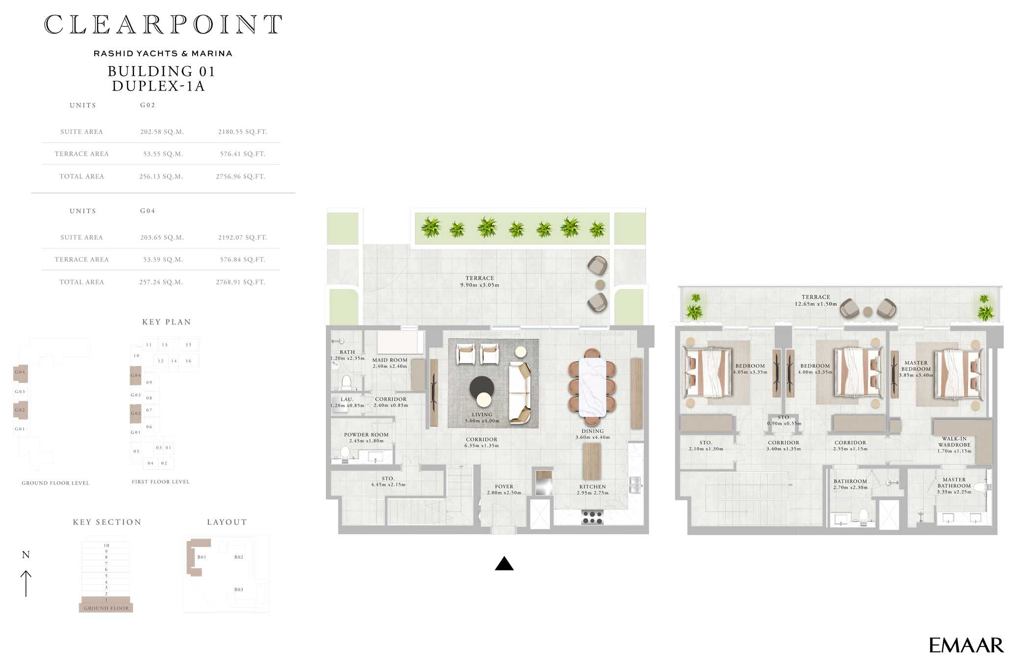 The building’s architecture blends modern elegance with coastal charm. Featuring a clean-lined contemporary façade, light-toned materials, and glass-fronted balconies, the design maximizes views and natural light. The building’s alignment within the Clearpoint trio creates a harmonious skyline along the marina edge, reflecting Emaar’s high standards of urban planning and aesthetics.