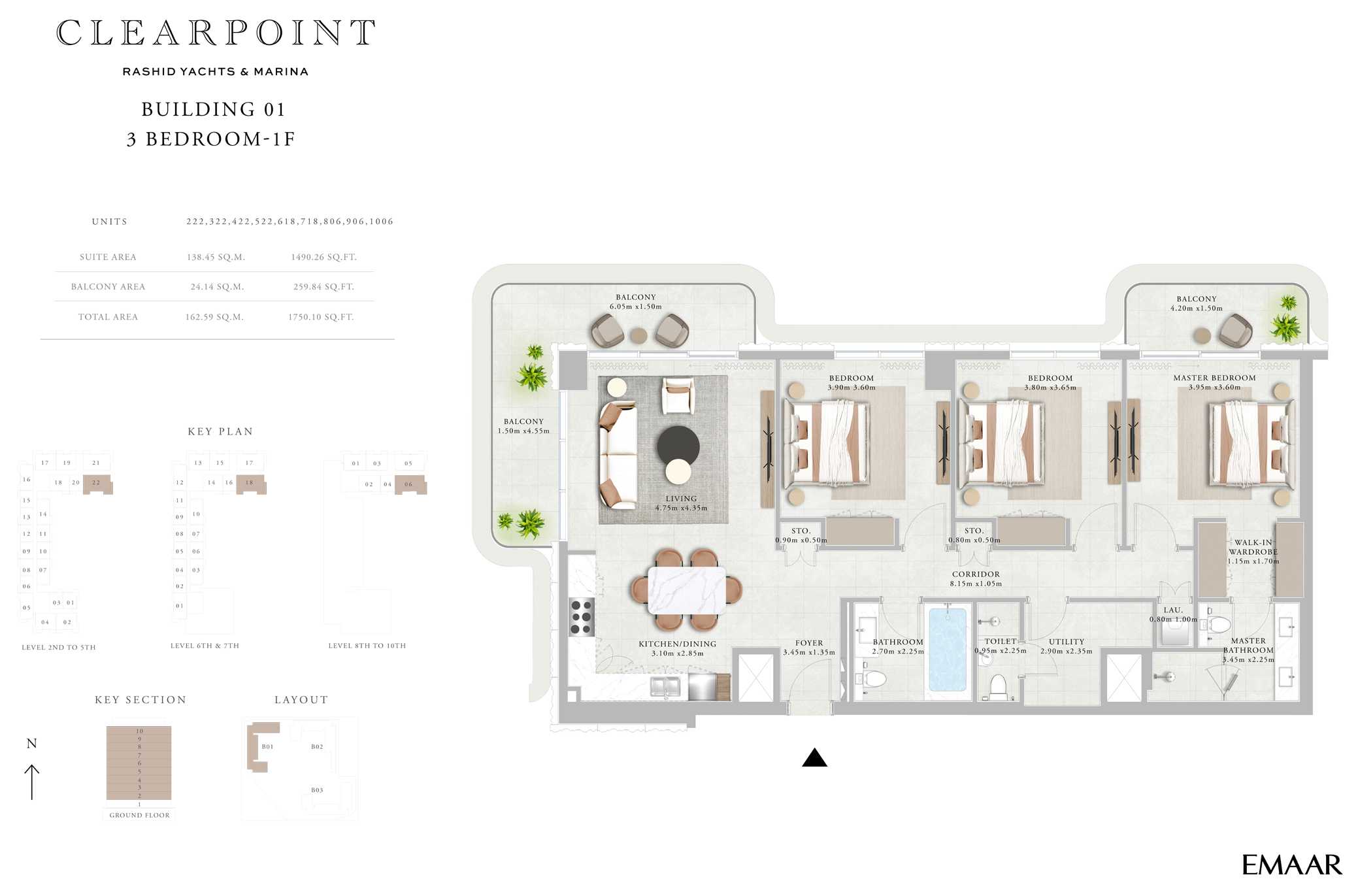 Residences in Clearpoint Building 1 are crafted to reflect a sophisticated waterfront lifestyle, offering a range of 1 to 3-bedroom apartments. Interiors feature open-plan layouts, floor-to-ceiling windows, and private balconies that frame calming views of the marina and surrounding landscaped promenades. High-quality finishes, modern kitchens, and spa-like bathrooms create a luxurious yet practical living experience.