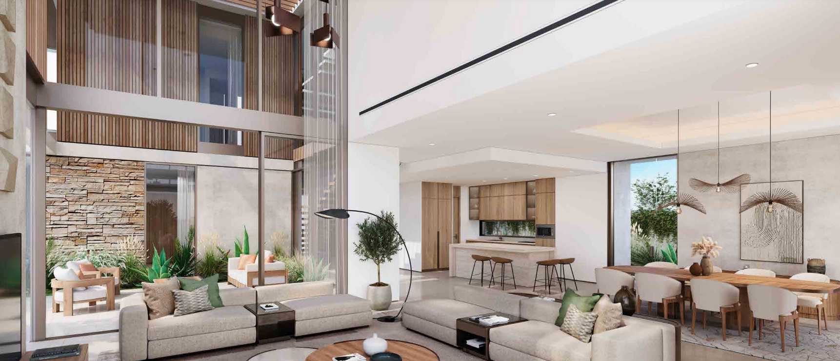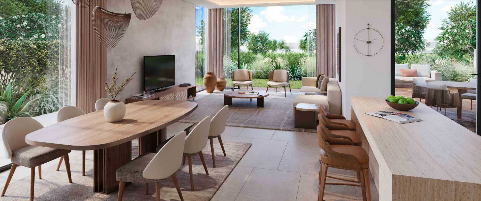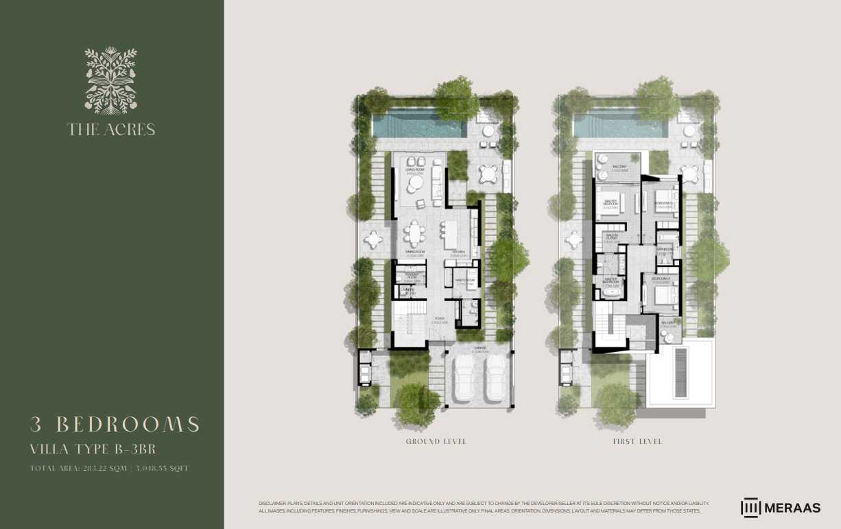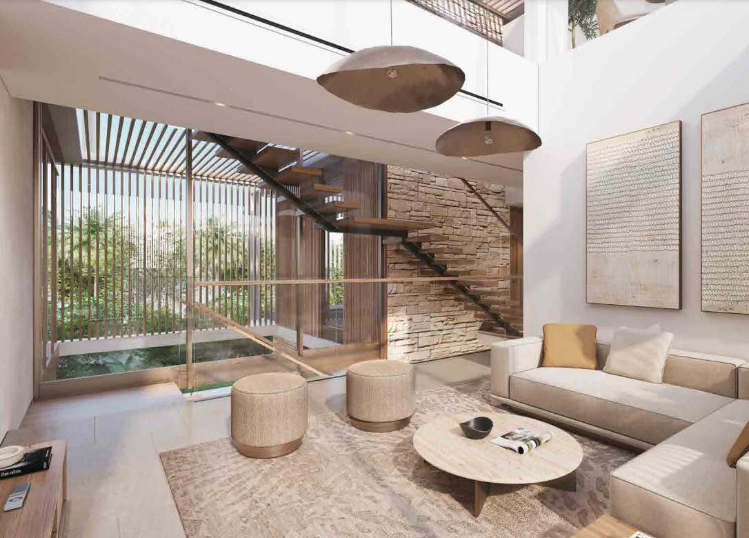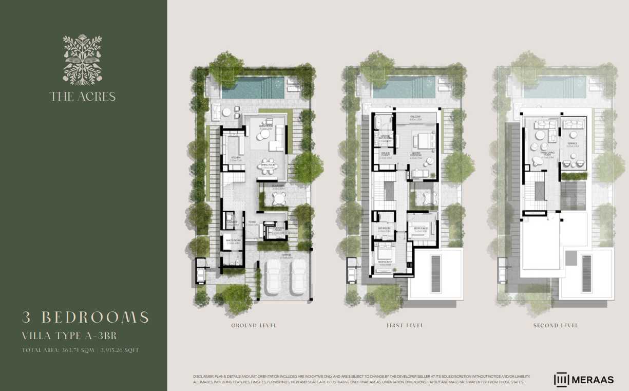 The Acres’ commitment to harmonious living can be seen in its 3-bedroom villas. The garden facade provides views of lush surroundings, encouraging a life entwined with nature. Inside, the home features a side courtyard with living spaces designed for intimate familymoments. The master bedroom on the first floor offers a view of the pool and frames park vistas. Additionally, a family area and a spaciousshaded terrace on the second floor seamlessly blend the home’s sanctuary with the wild beauty of the parklands.