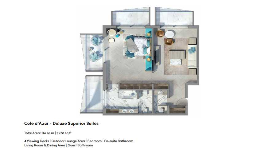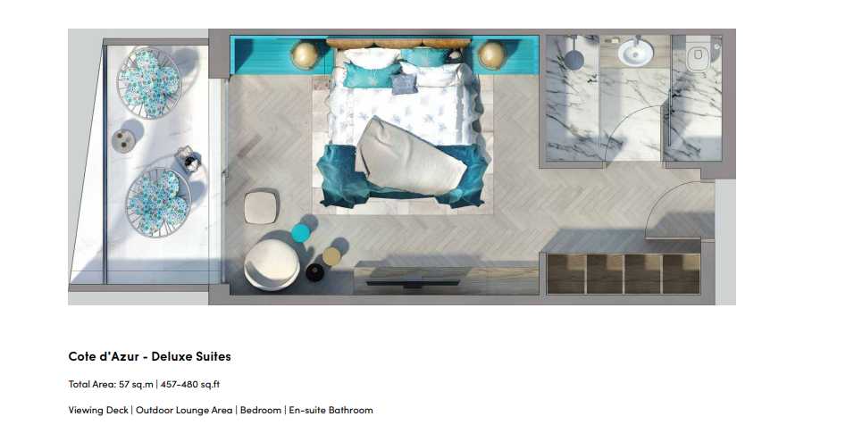 The Heart of Europe premium beach hotel's newest residence, the Côte d'Azur, has 893 units. The hotel will provide magnificent apartments with balconies, suites, and rooms of the highest caliber in a contemporary Mediterranean design. One of the island's unique attractions will be its magnificent vacation destination.