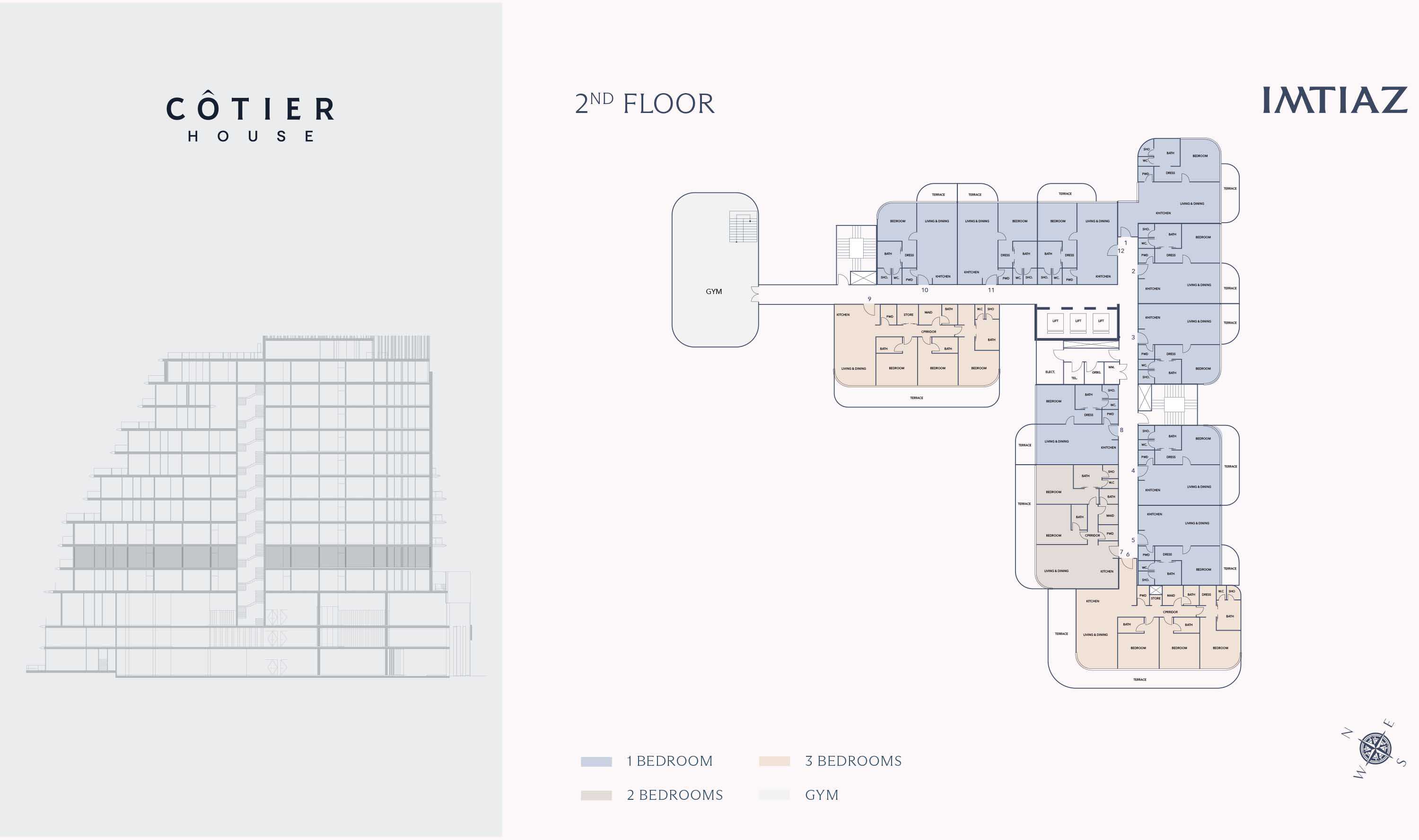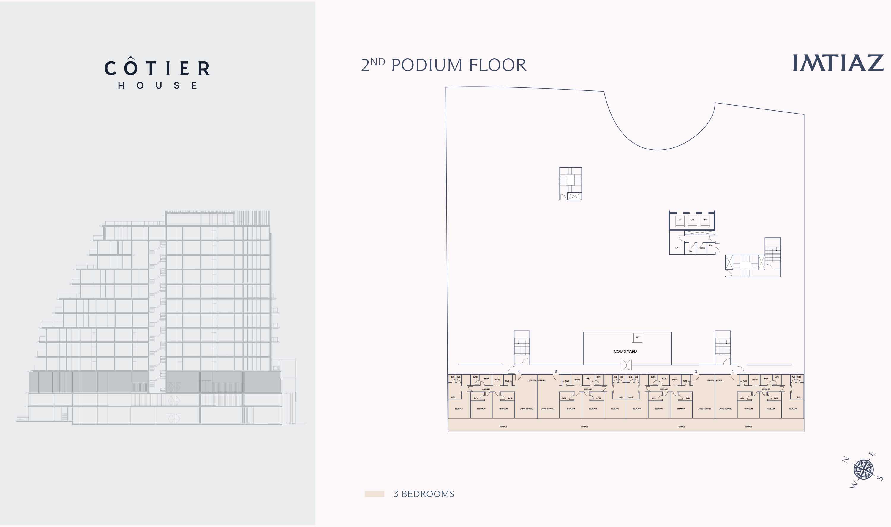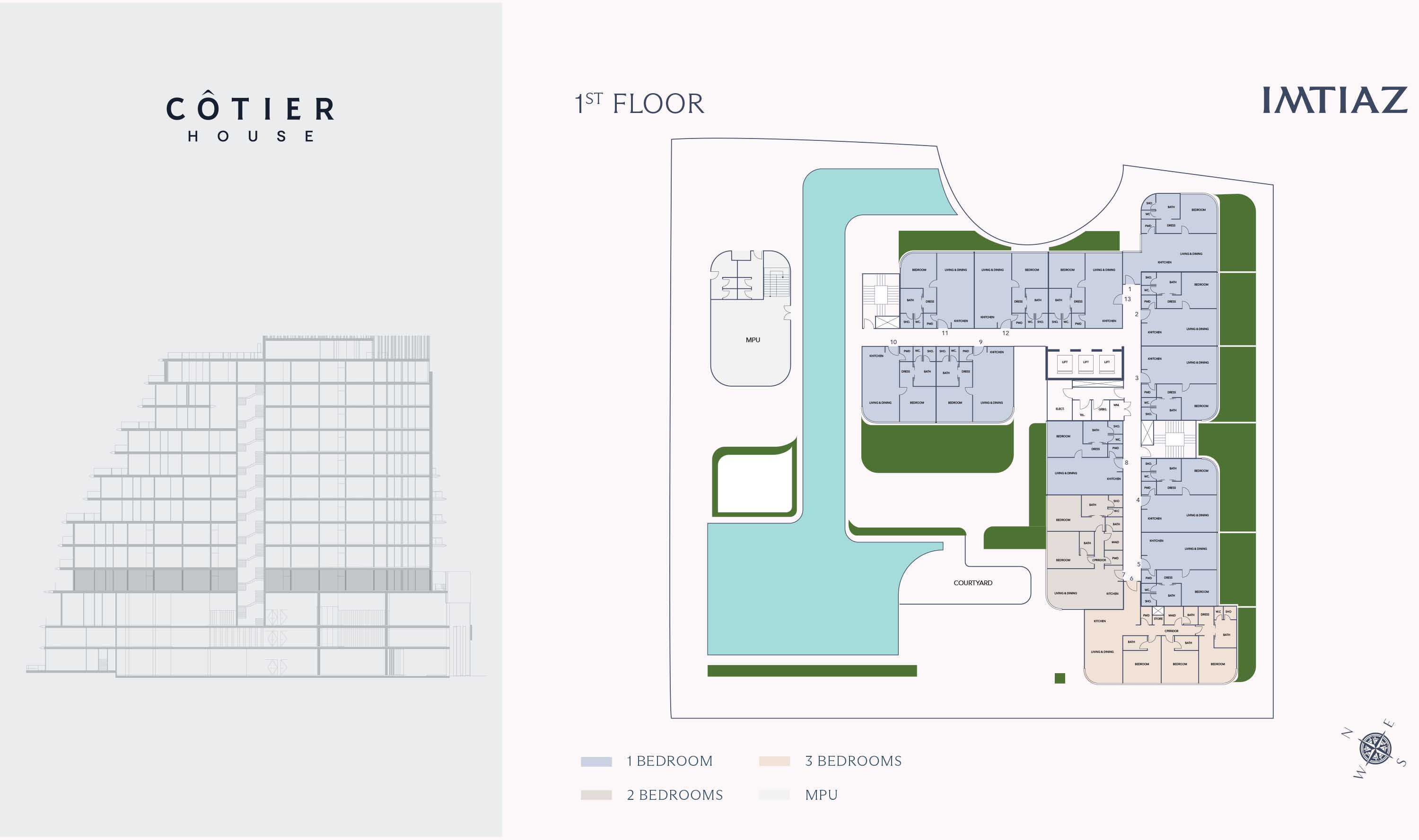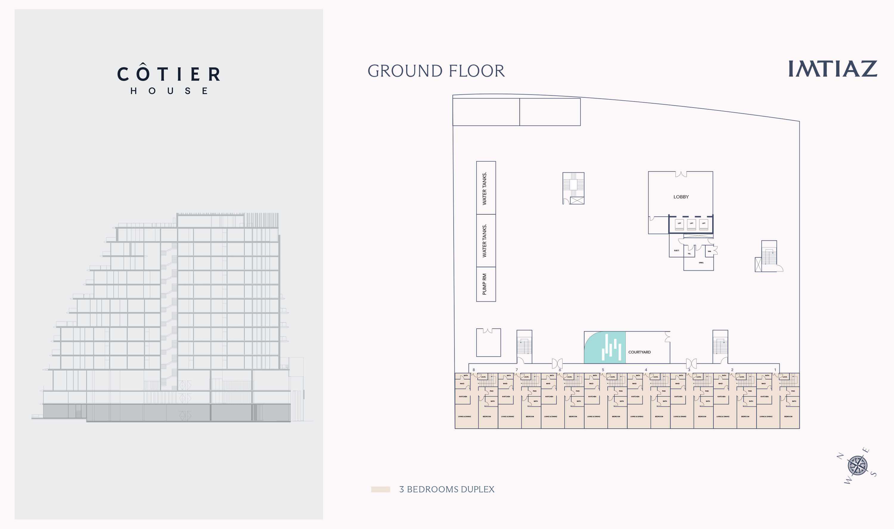 Ground Floor: A concierge reception lobby, a coworking lounge with private meeting rooms, and a landscaped outdoor courtyard.