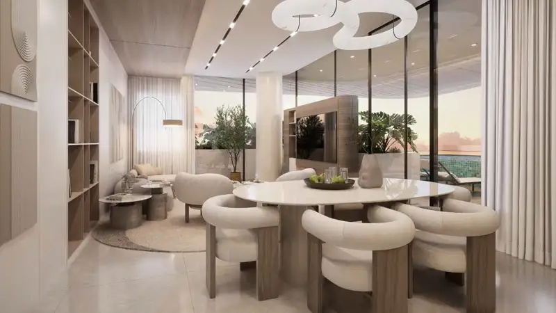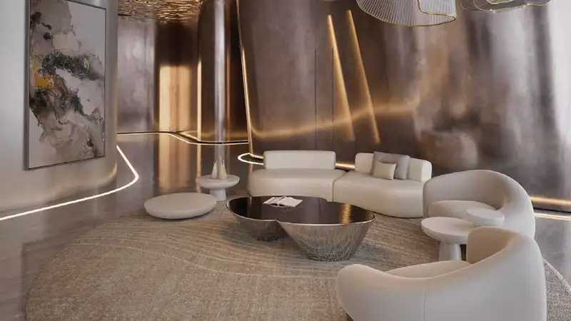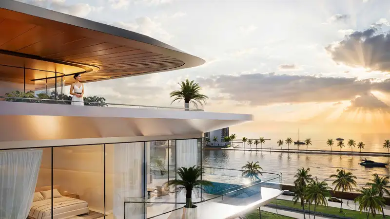 The continuous G+7 architecture, which maximizes panoramic sunset views during design, makes up the majority of the architecture, which reflects a modern splendor with coastal characteristics. Every single facade is exquisitely crafted to let in natural light without compromising privacy, creating an open yet cozy atmosphere. By integrating AI technology, the property transforms into the UAE's first lifestyle destination where intelligent living and elegant design coexist. The views of the unspoiled marina are complemented by landscaped gardens and overlapping outdoor terraces with infinity pools, creating a connection between the internal and outdoor areas and achieving a delicate balance of luxury and beauty.