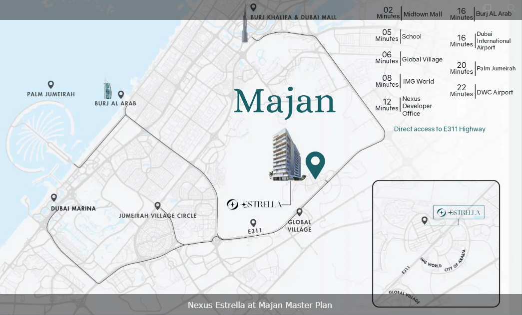 Strategically positioned in Majan within the Wadi Al Safa 3 area, Estrella benefits from a location that seamlessly blends tranquility with accessibility. Majan is a well-planned community within DubaiLand—one of Dubai’s largest and most ambitious mixed-use developments. The area is surrounded by numerous family-friendly attractions and leisure destinations such as Global Village, IMG Worlds of Adventure, and the Al Barari community. It’s also within easy reach of key areas including Arabian Ranches, Motor City, and Silicon Oasis.