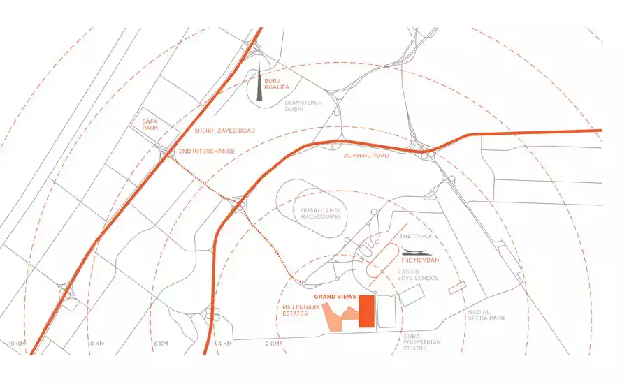 Grand Views is a posh neighborhood in Meydan City that features a variety of townhomes and villas. The G&Co project is on the Dubai-Al Ain Road (E66), which links locals to important city locations.