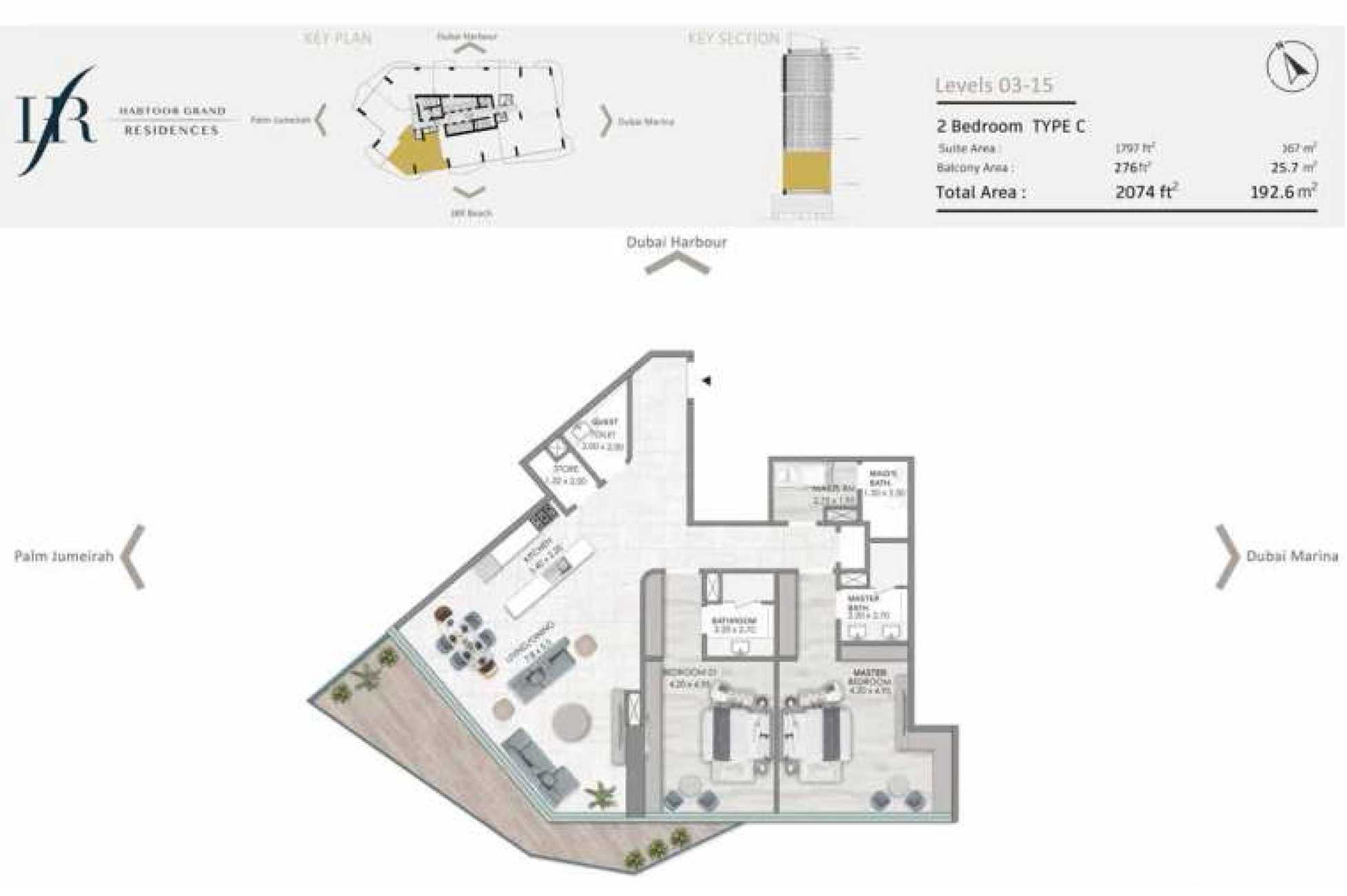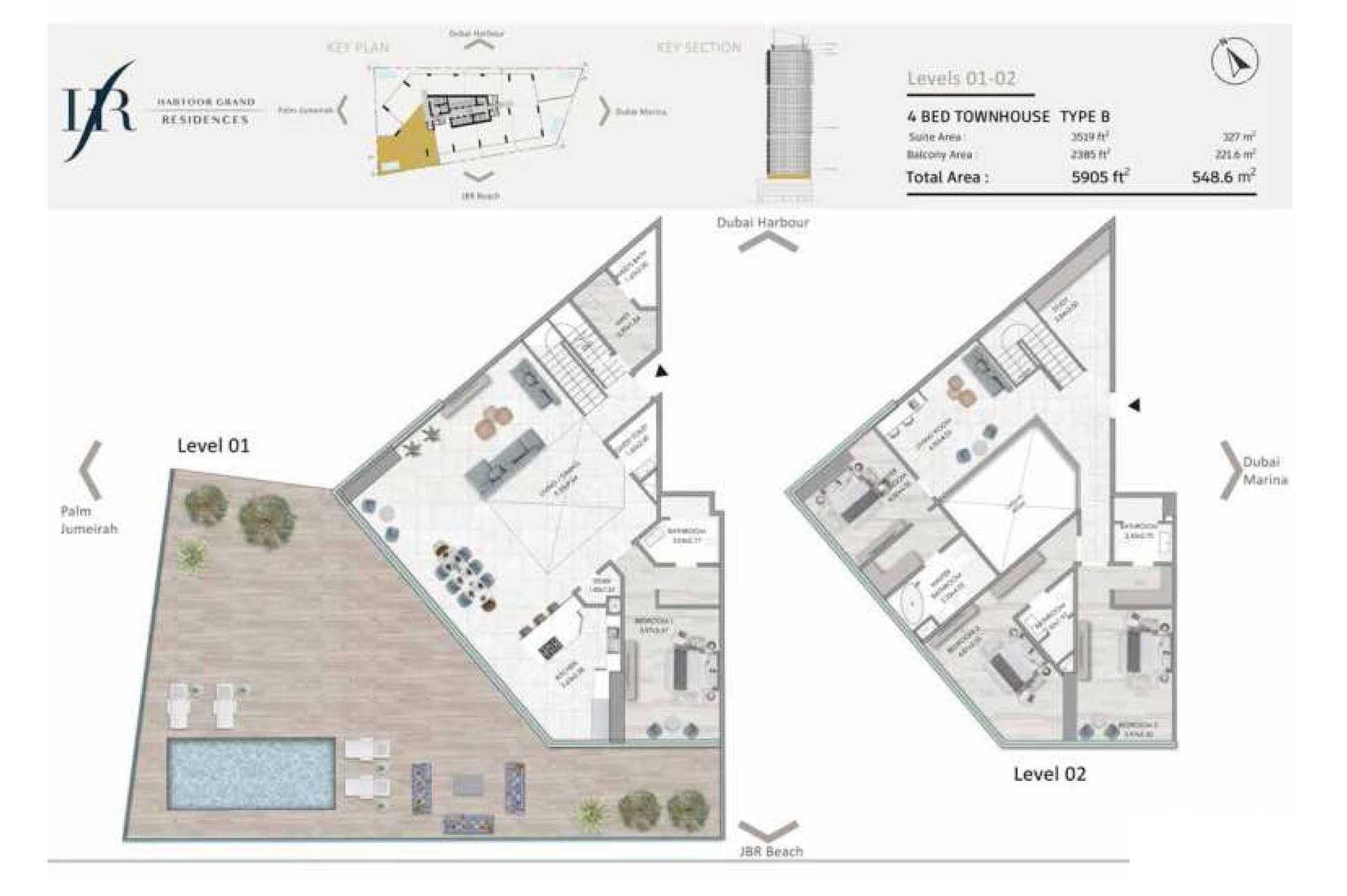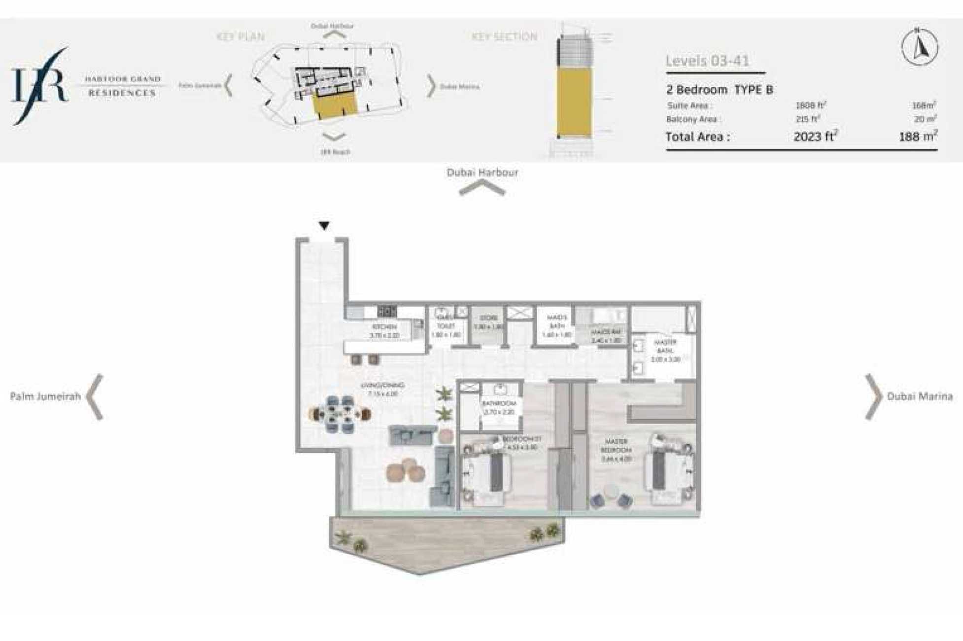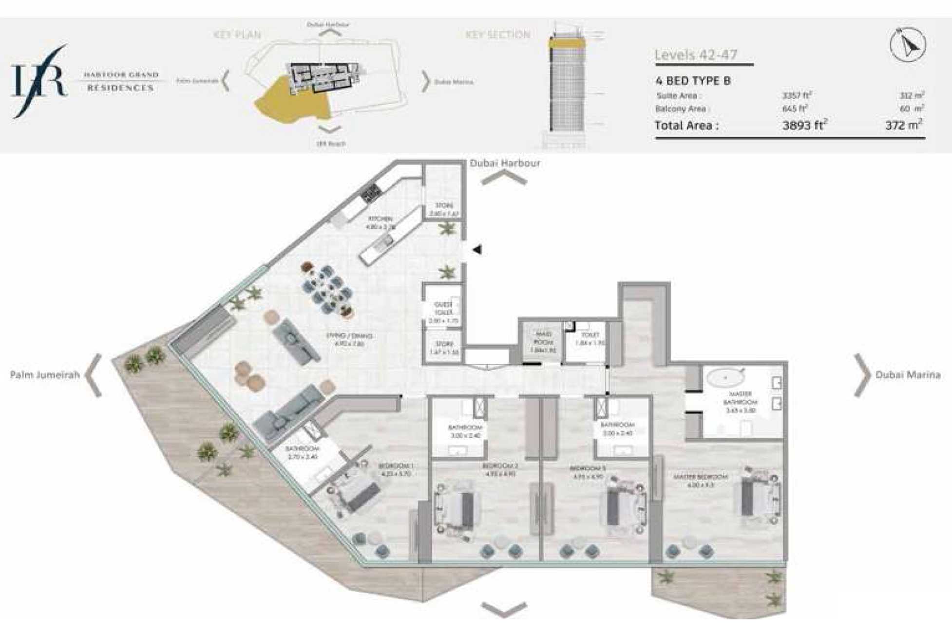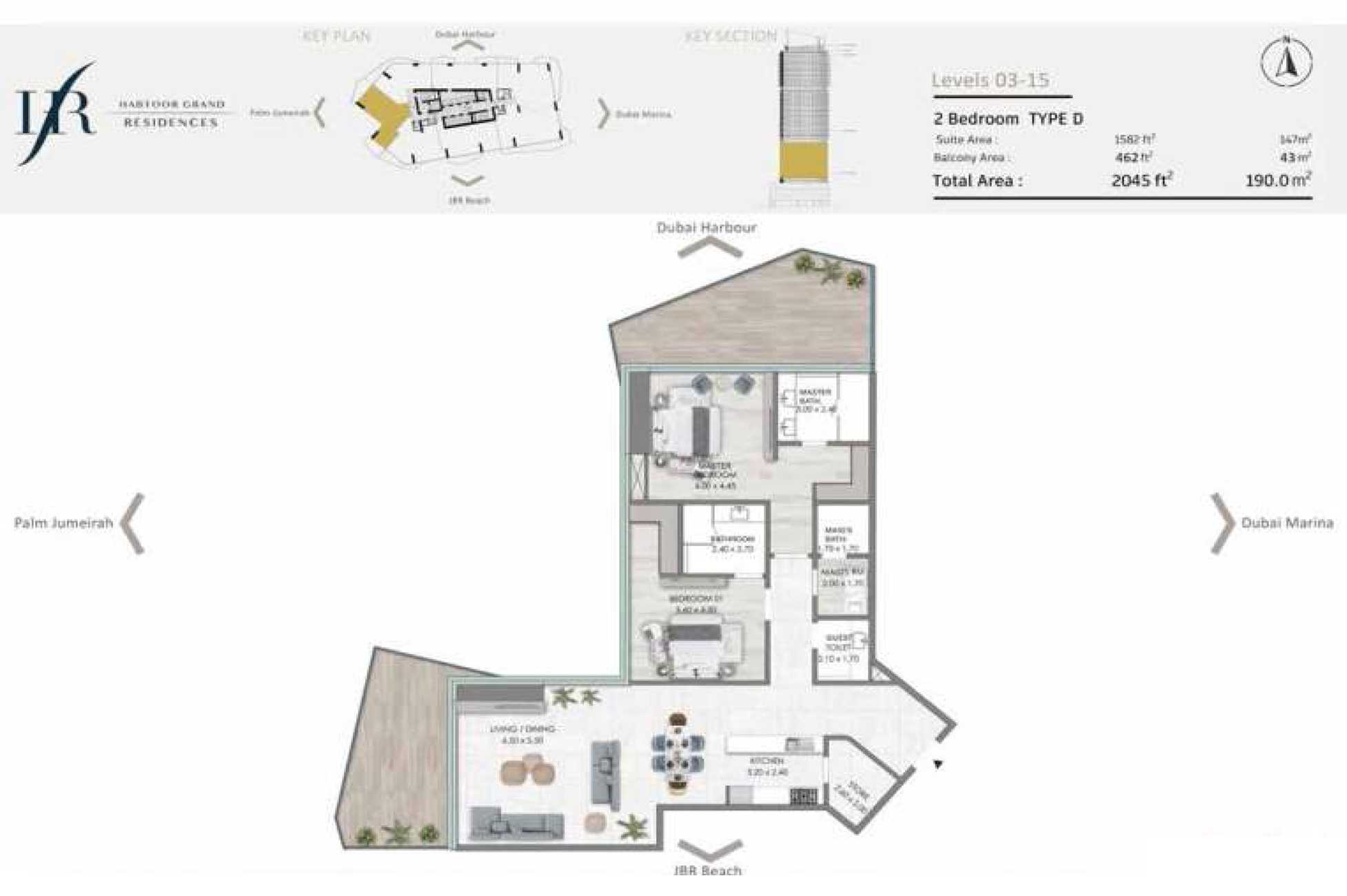 Developed by Al Habtoor Group, Habtoor Grand Residences is a G+49-story luxury residential tower redefining sumptuous living with 2 to 4-bedroom flats, townhouses, and penthouses in the center of Jumeirah Beach, Dubai Marina. Every apartment in this tall building has an amazing view of the Gulf and Dubai Marina, providing tenants with an unmatched waterfront experience every morning.