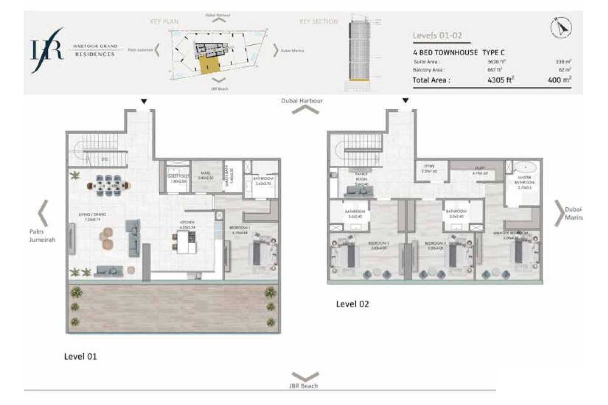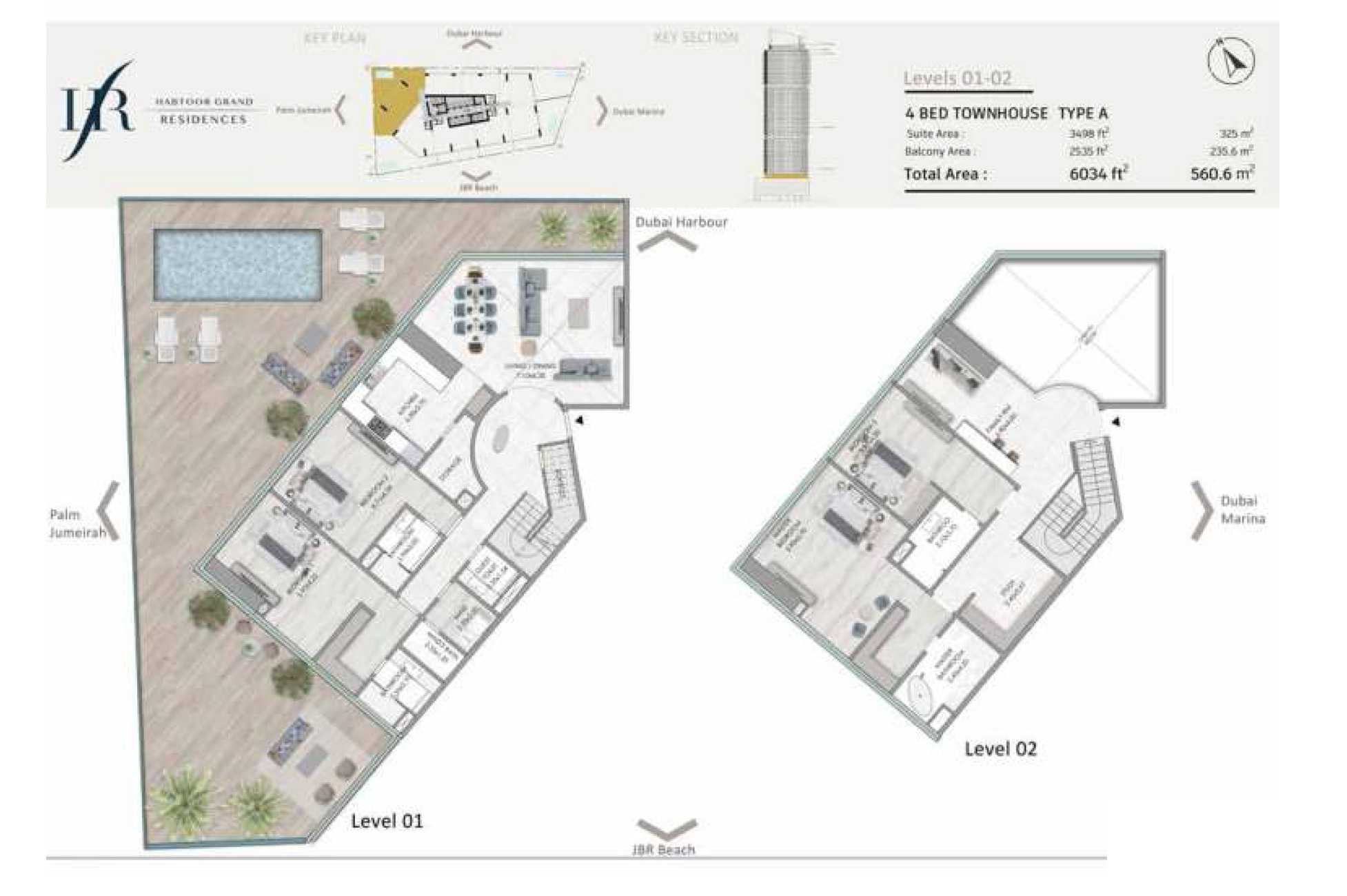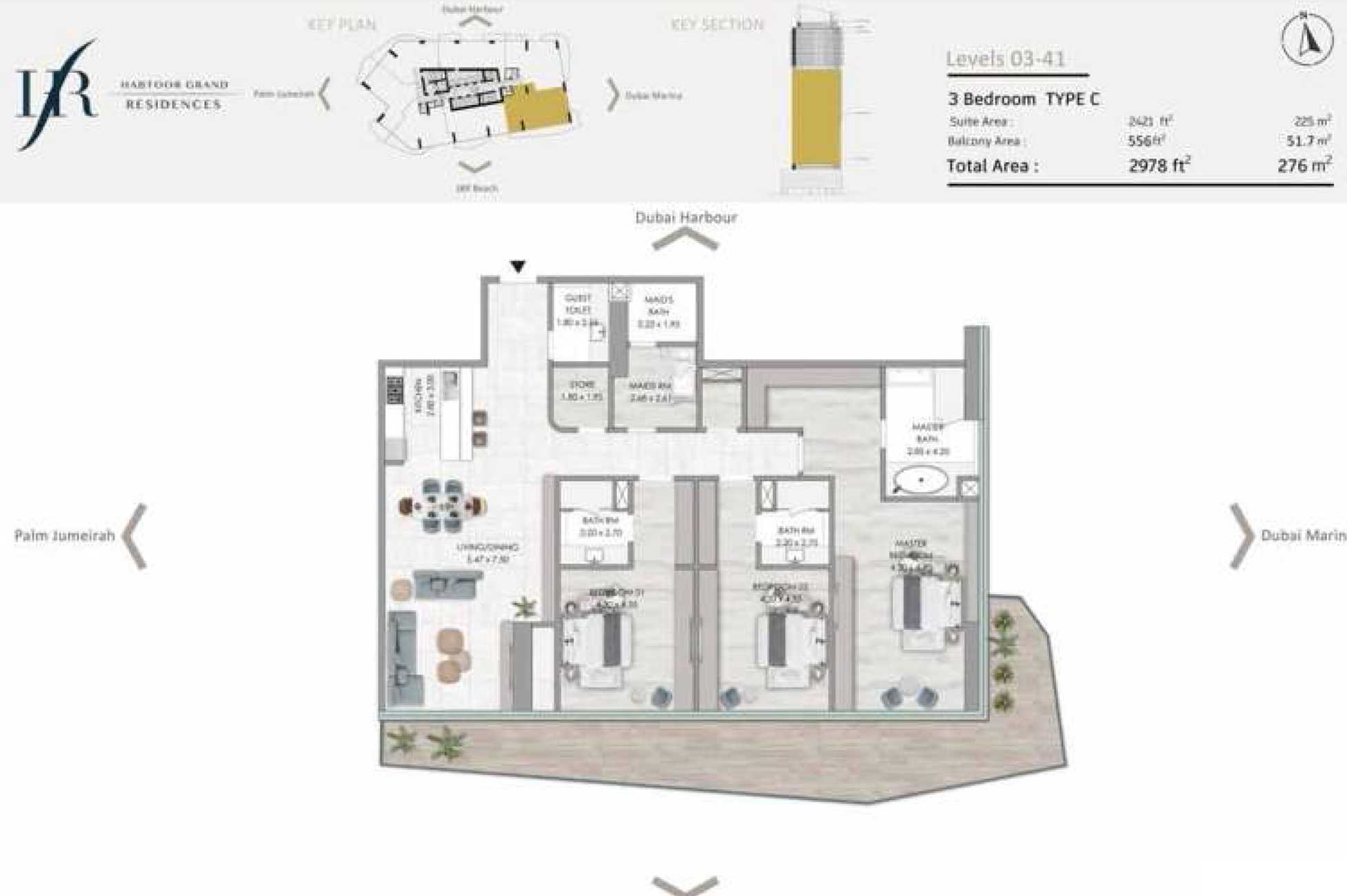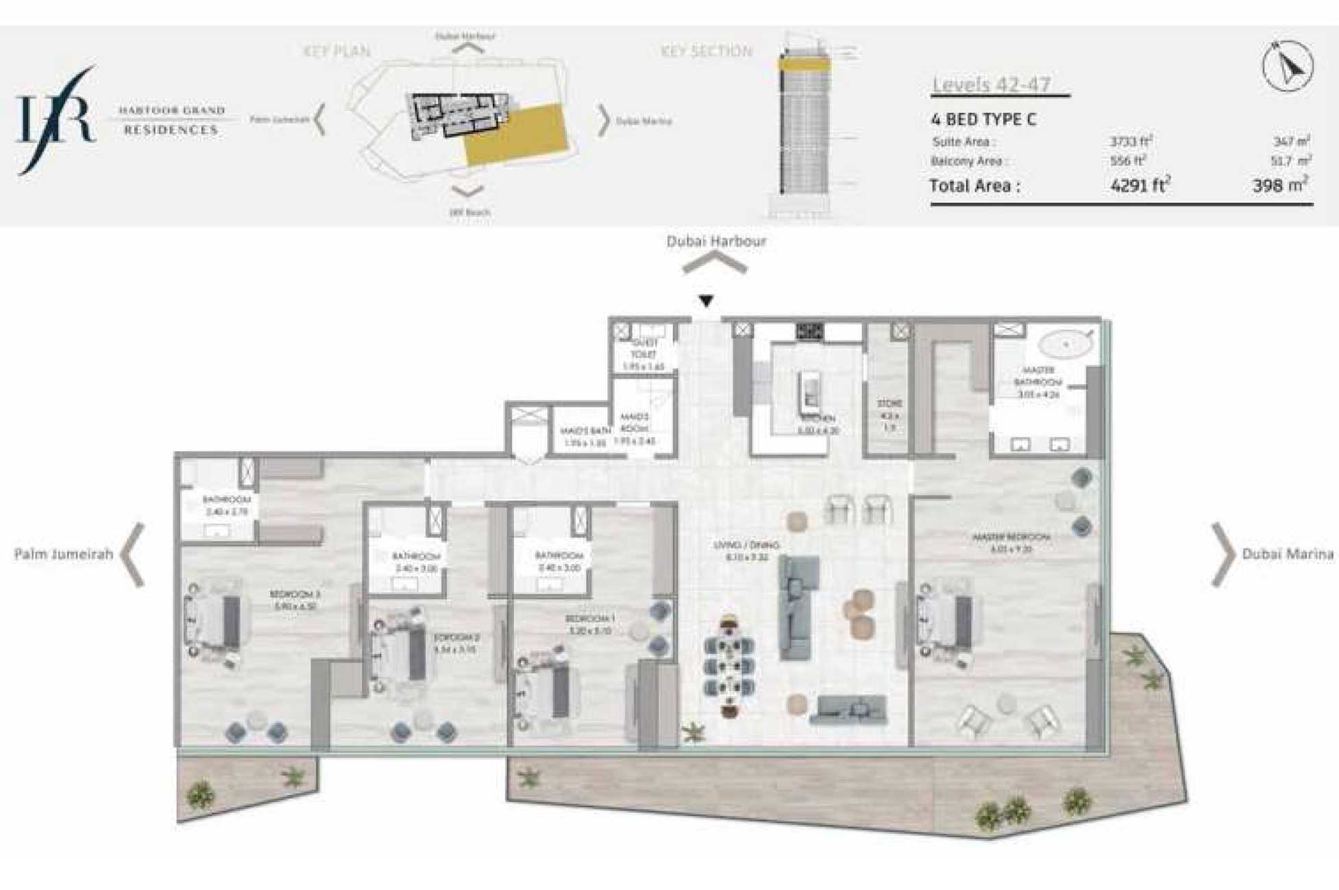Developed by Al Habtoor Group, Habtoor Grand Residences is a G+49-story luxury residential tower redefining sumptuous living with 2 to 4-bedroom flats, townhouses, and penthouses in the center of Jumeirah Beach, Dubai Marina. Every apartment in this tall building has an amazing view of the Gulf and Dubai Marina, providing tenants with an unmatched waterfront experience every morning.