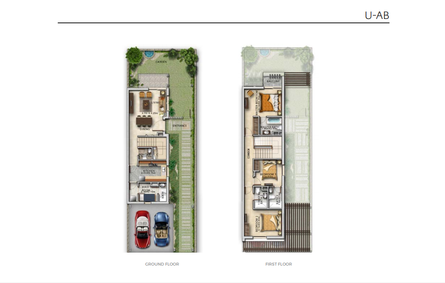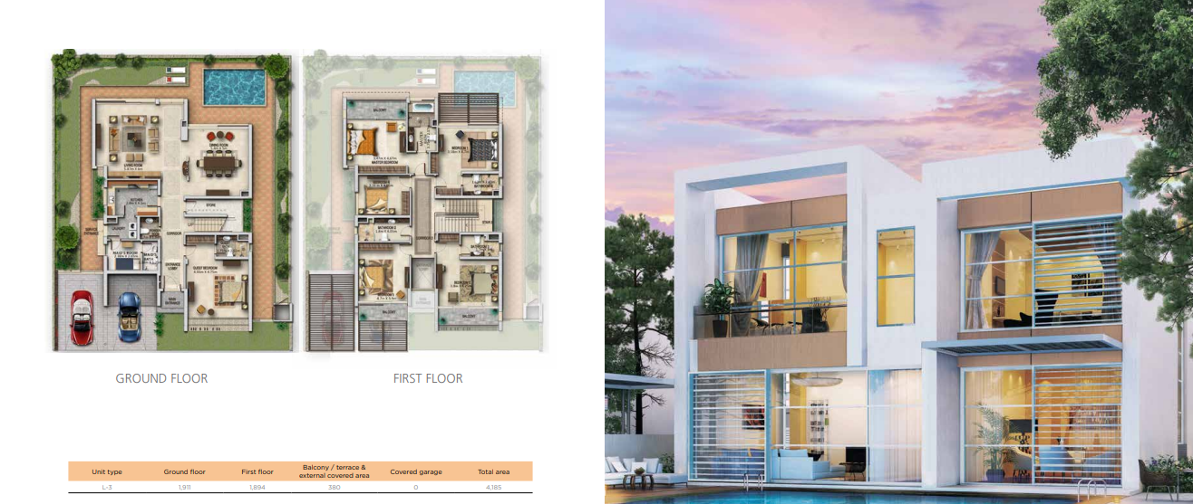 There is one Bedroom & Attached bath on ground floor. 1 Maid’s room with Maid’s Bath, one powder room, dining with Living room, Kitchen and wide Greenery area outside on Ground Floor. Store room under stairs, Garage with 2 car’s parking space is also there. There is Laundry, Corridor and Swimming pool also on Ground Floor.