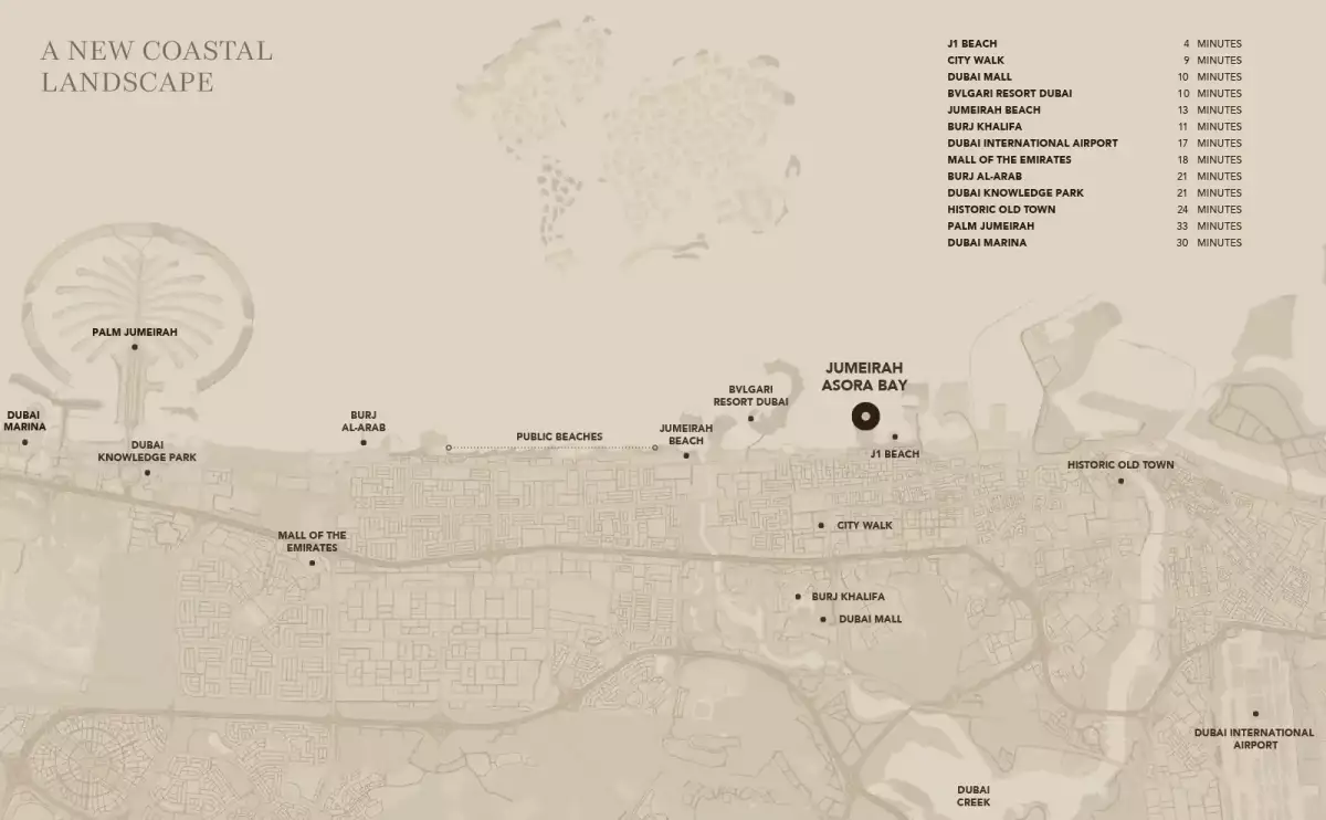 Ideally located within La Mer, Jumeirah, Asora Bay stands as one of Dubai’s most prestigious coastal destinations—seamlessly merging the city’s dynamic lifestyle with the calm rhythm of the sea. Positioned just five kilometres from Downtown Dubai, residents enjoy effortless access to Burj Khalifa, The Dubai Mall, and City Walk, as well as the charming Old Town, the Bvlgari Resort, and Dubai’s sparkling beaches.