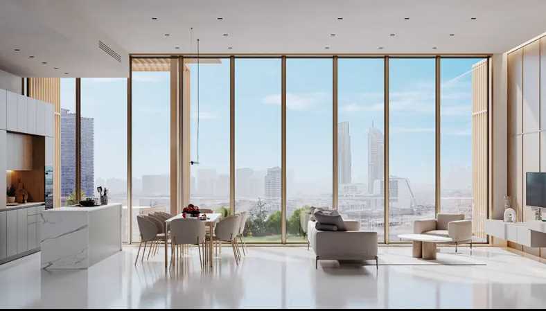 Higher floors deliver glimpses of Dubai skyline landmarks like Burj Khalifa, while some enjoy unobstructed desert skyline views.