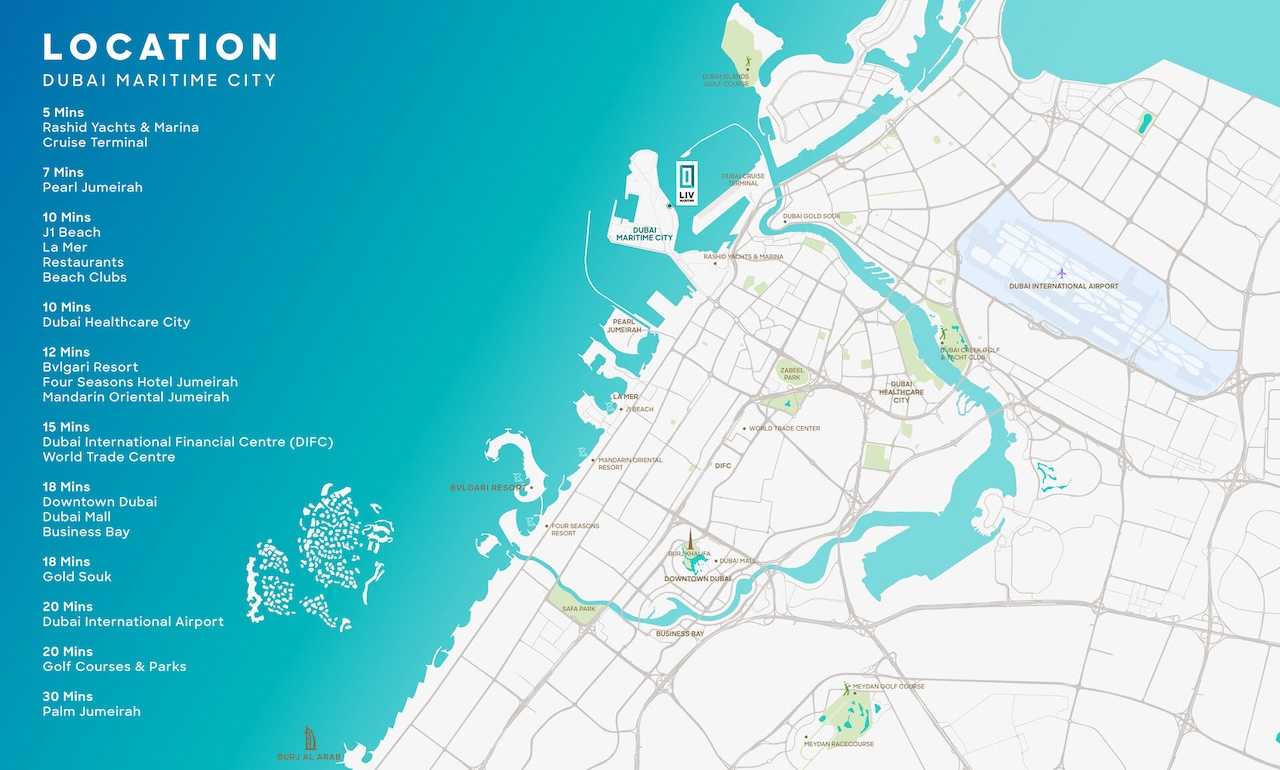 LIV Maritime is situated in Dubai's rapidly growing waterfront neighborhood, Maritime City. Easy access to important locations like Sheikh Zayed Road and Oud Metha Road is guaranteed by its ideal position. DIFC and Business Bay can be reached in 26 minutes, while Dubai International Airport and Downtown Dubai are only 25 minutes away. Residents may enjoy the ideal blend of metropolitan convenience and beach peace thanks to this well-planned location.