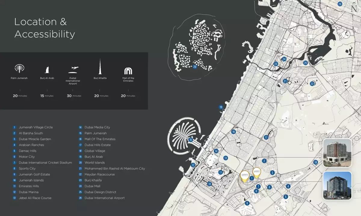 Jumeirah Village Circle (JVC), Lucky Royale Residence is a remarkable urban development by Lucky Aeon that offers studios, one, two, and three-bedroom apartments, as well as three and four-bedroom sky villas. With its tasteful fusion of contemporary architecture and lavish amenities, this prestigious residential development redefines luxury living and offers its residents an unmatched quality of life.