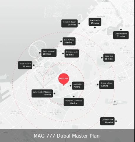 Another highlight of MAG 777 is its connectivity. Residents can reach Dubai Mall in just a quick 25-minute drive and Palm Jumeirah is only 19 minutes away. Burj Al Arab is a 21-minute drive, and The Walk at JBR takes 23 minutes by car. In addition, the project is only 29 minutes away from Dubai International Airport, and the new Al Maktoum International Airport can be reached in 27 minutes from here.