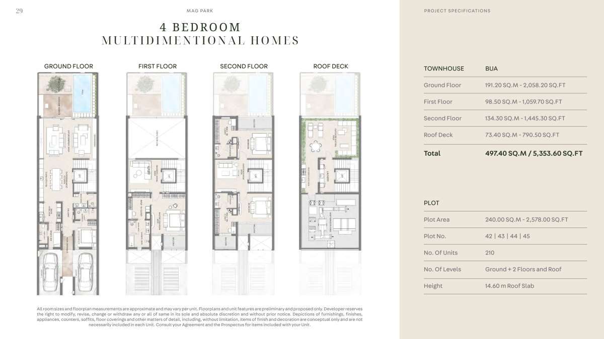 The tranquilly and beauty of MAG Park by MAG, which provides townhouses with four or five bedrooms in Meydan District 7 in MBR City, will captivate you. Here is where you can enjoy the abundant life of nature and find the home of your dreams. The façade and interior of the development exhibit an exceptional harmony of grandeur, splendour, and elegance. MAG Park is a wonderful example of balancing tradition and modernity. You will be amazed and captivated by the brilliance of the colour panels. With its lush surroundings and opulent amenities, MAG Park offers everything you could possibly want. It's a place where you can write new chapters in your life, share life-changing experiences, and create new stories.While making sure that its living spaces are sensible and affordable, the development welcomes you to a sophisticated urban lifestyle catered to contemporary tastes and conveniences. The idea seeks to capture the evolving evolution of one of the most identifiable cities in the world. Living here offers you a breathtaking view of Dubai's transformation.