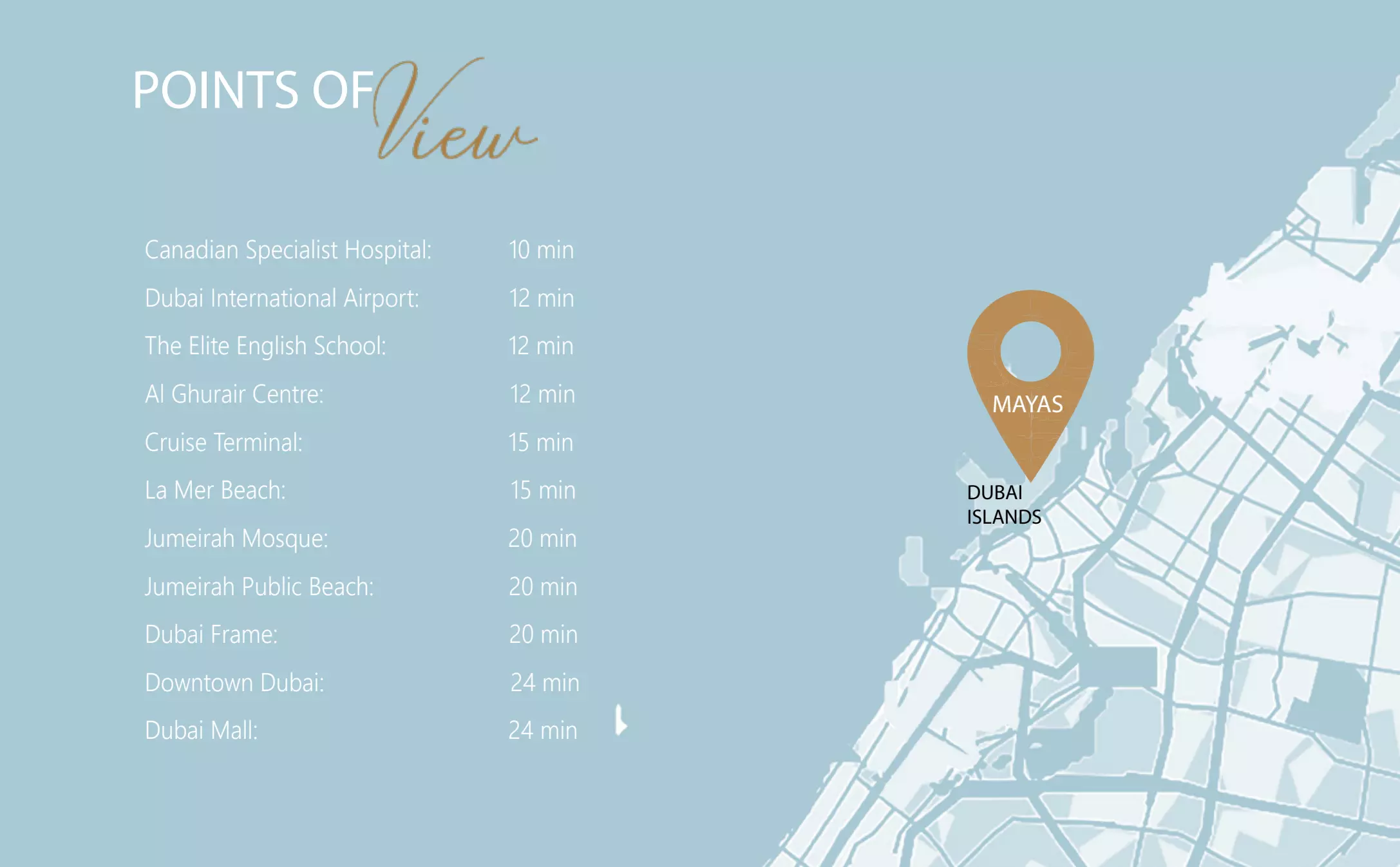 Ideally situated on the Dubai Islands, Mayas Sea View offers a unique setting that blends the calm of the seaside with the energy of the city. The location of the development provides inhabitants with: