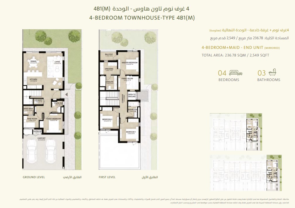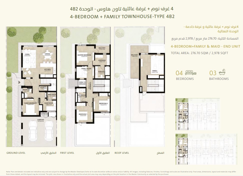 The townhouses come in 3 and 4-bedroom layouts of different sizes and types. The majority of the Mudon Al Ranim townhouses are set around the perimeter of the park such that residents which offering views of greenery.