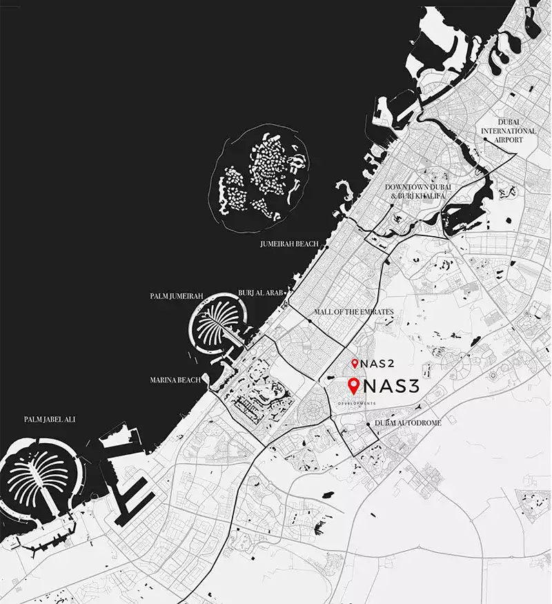 Nestled in the heart of Arjan, NAS 3 enjoys a prime location that perfectly balances urban convenience with serene surroundings. Enjoy effortless access to major city destinations like Dubai Miracle Garden, Dubai Autodrome, Mall of the Emirates, and Burj Khalifa, all just minutes away, while relishing the peaceful charm of your private retreat.