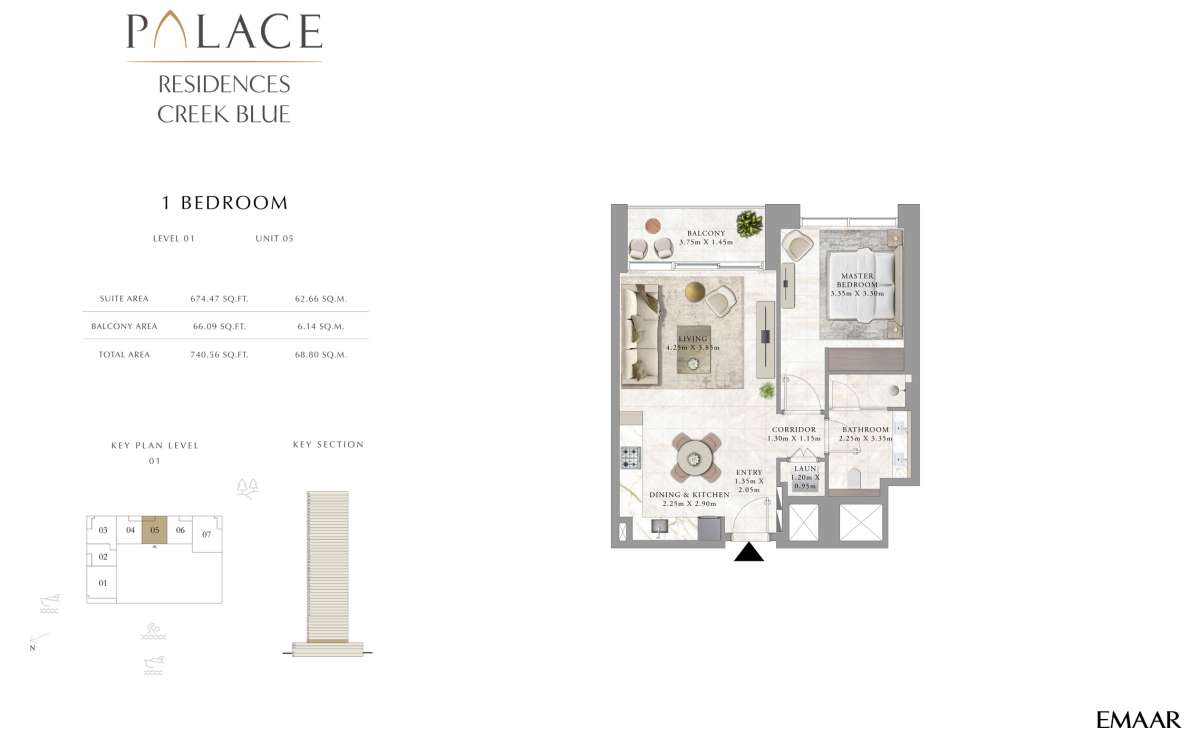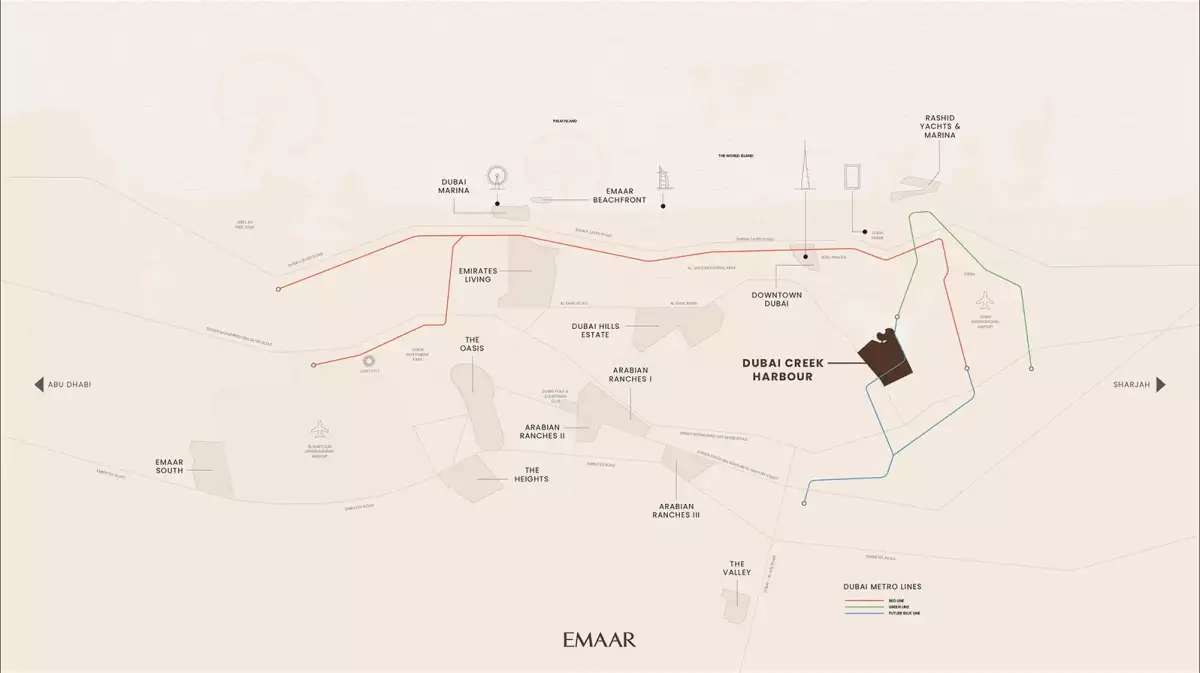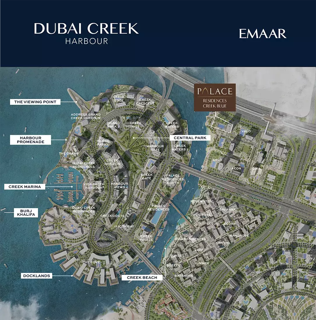 In Dubai Creek Harbour, Palace Residences Creek Blue has a prime position. This neighborhood is renowned for its breathtaking views of the waterfront, first-rate lifestyle amenities, and close access to important Dubai landmarks. If you live here, you'll always be near: