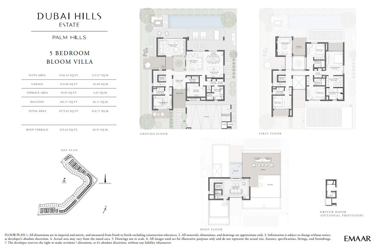 A minimum of five bedrooms and a maximum of five bedrooms are features of every Palm Hills home. These opulent mansions are available in several sizes: