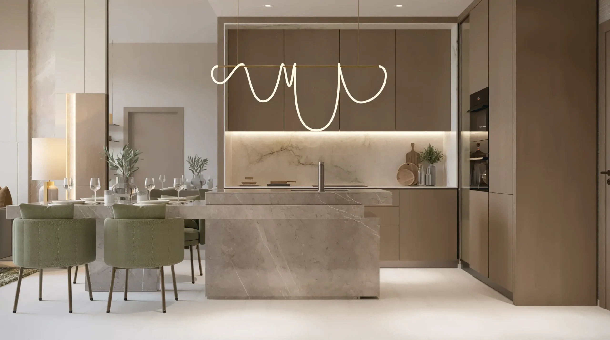 Interiors feature premium finishes: stone countertops, wood-style flooring, built-in wardrobes, energy-efficient glazing, and high ceilings.