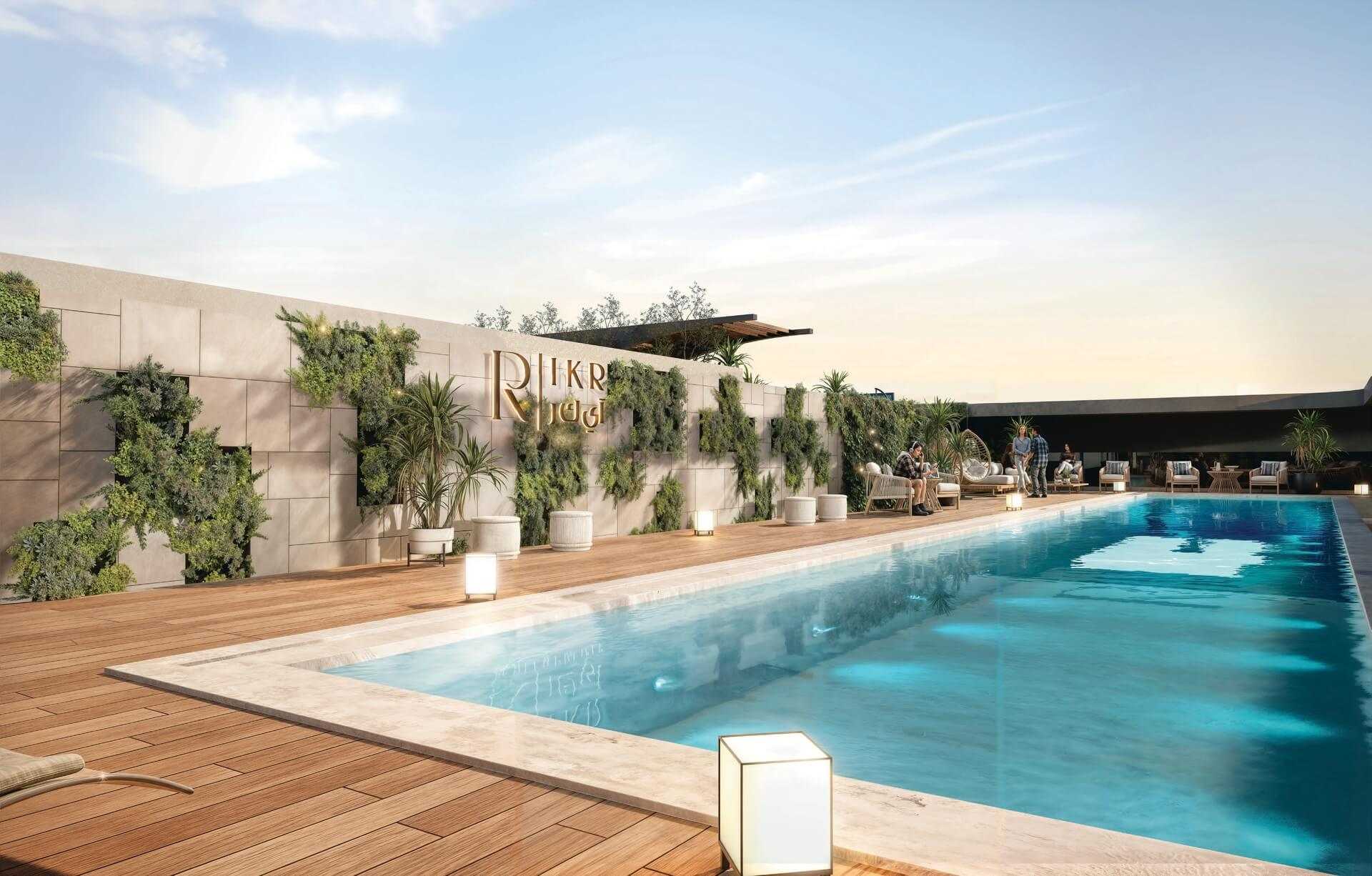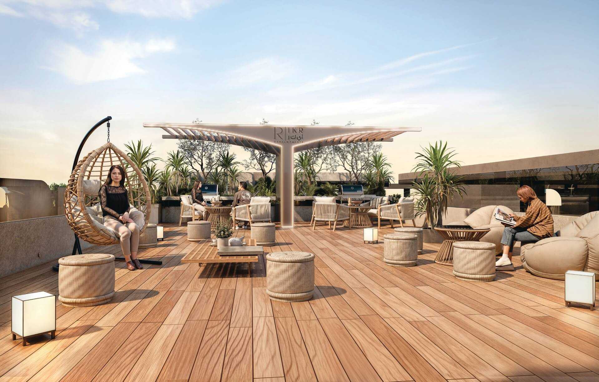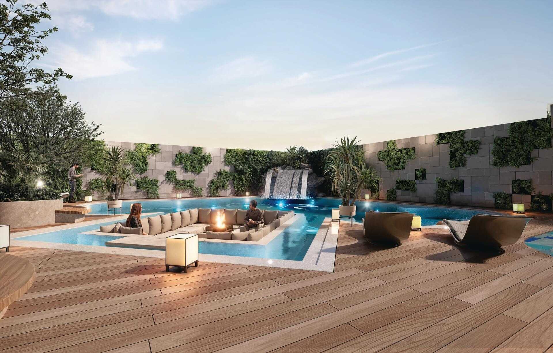 Roof-top infinity pool with views over JVC’s lush greenery and skyline—paired with sun loungers and a shaded deck.